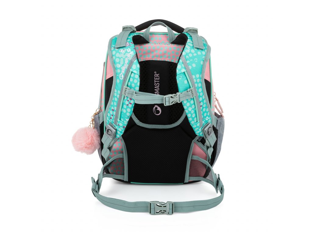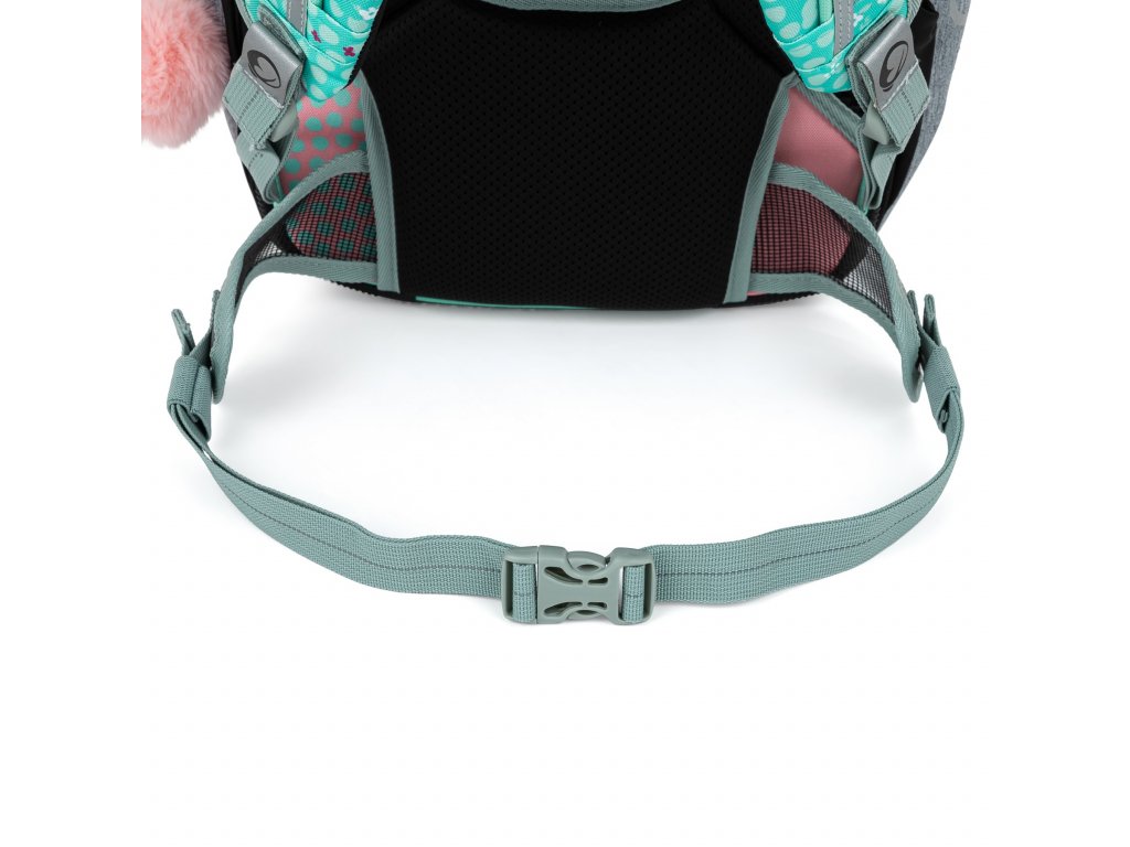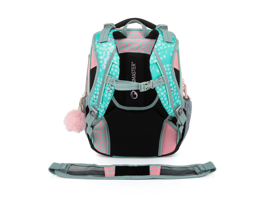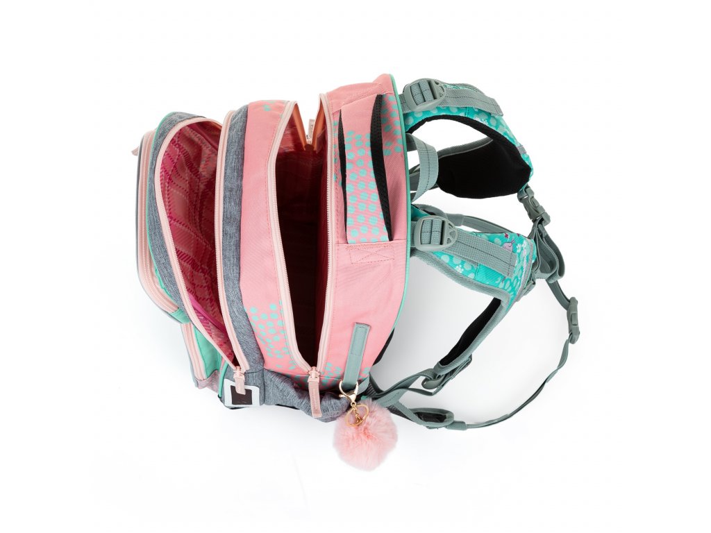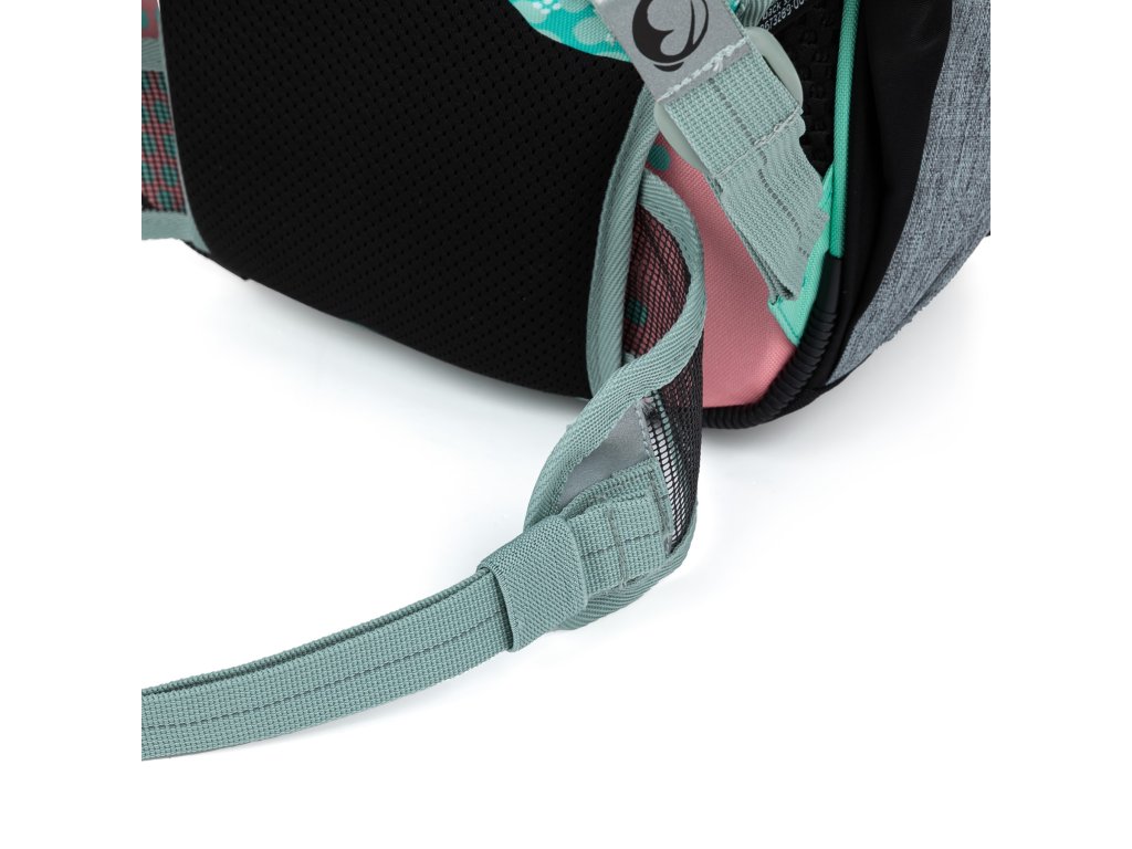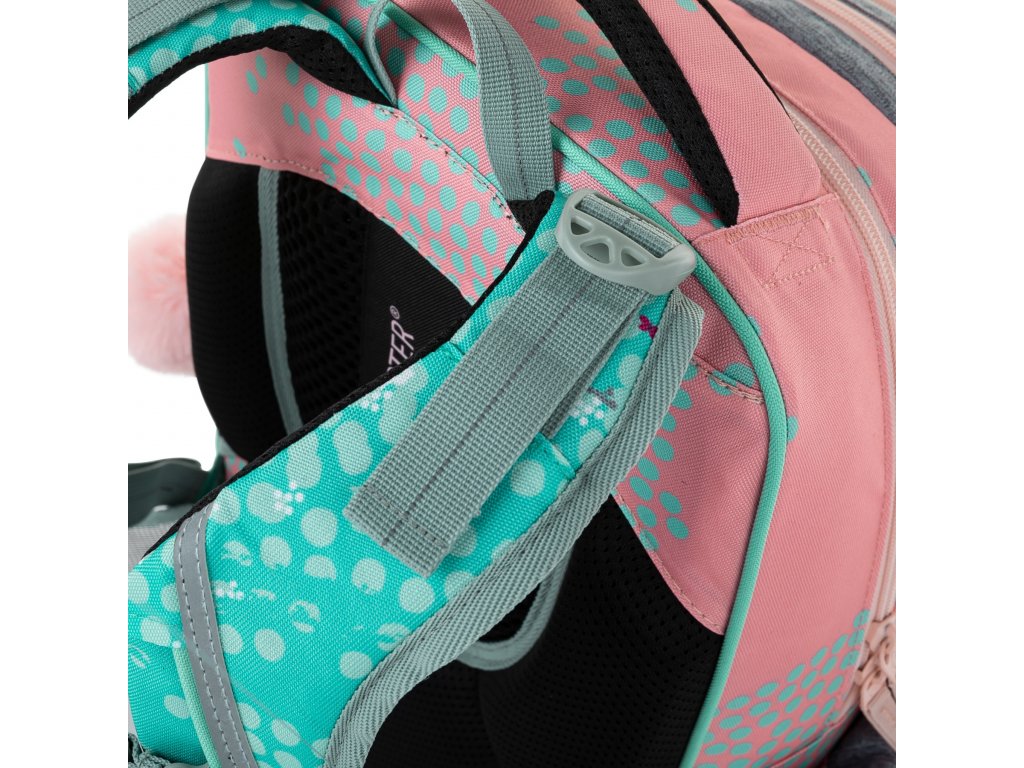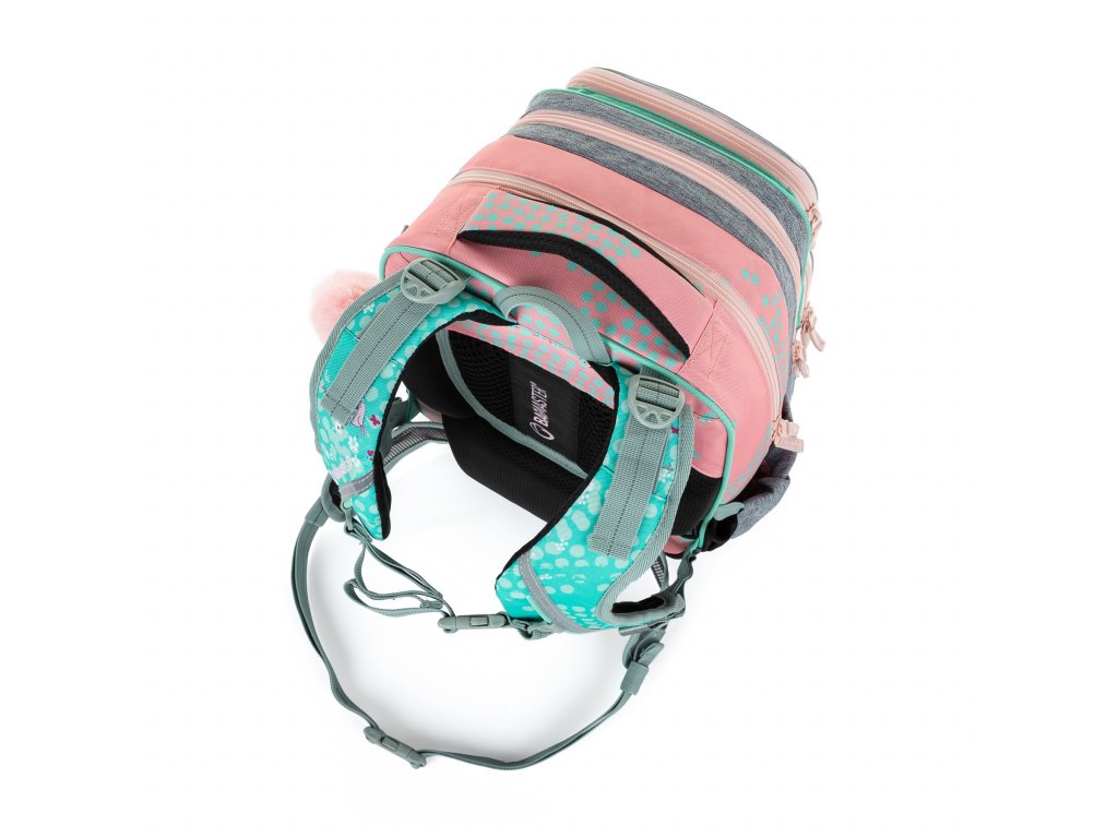 - Ramenní popruhy i zádový systém jsou měkce polstrované. Popruhy se nastavují pomocí horních a dolních plastových spon. Je třeba upravovat délku podle toho, jak školačka roste. Celková délka je 36 cm. Konce popruhů jsou magnetické. Aby neblincaly, jednoduše je magnetem připnete nad plastovou sponu