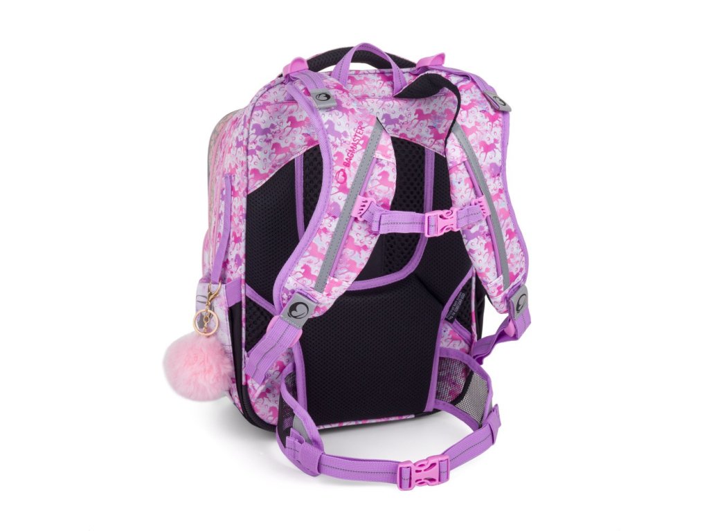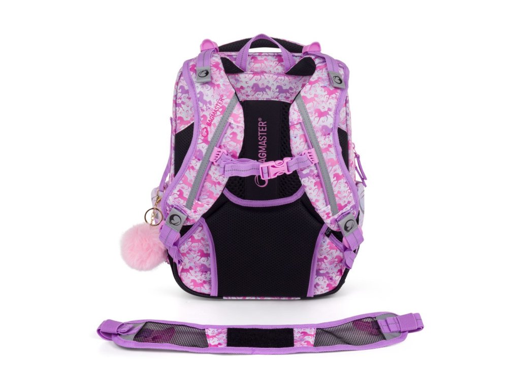 - Ramenní popruhy i zádový systém jsou měkce polstrované. Popruhy se nastavují pomocí horních a dolních plastových spon. Je třeba upravovat délku podle toho, jak školačka roste. Celková délka je 36 cm. Konce popruhů jsou magnetické. Aby neblincaly, jednoduše je magnetem připnete nad plastovou sponu.