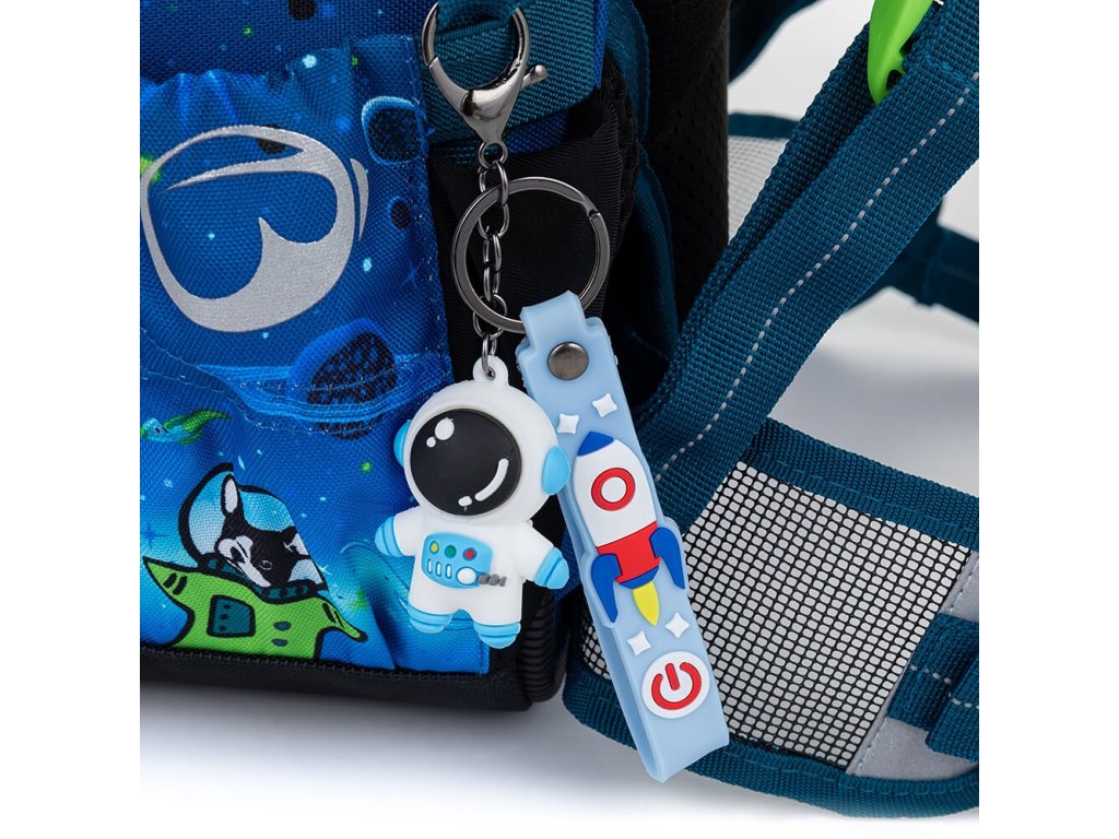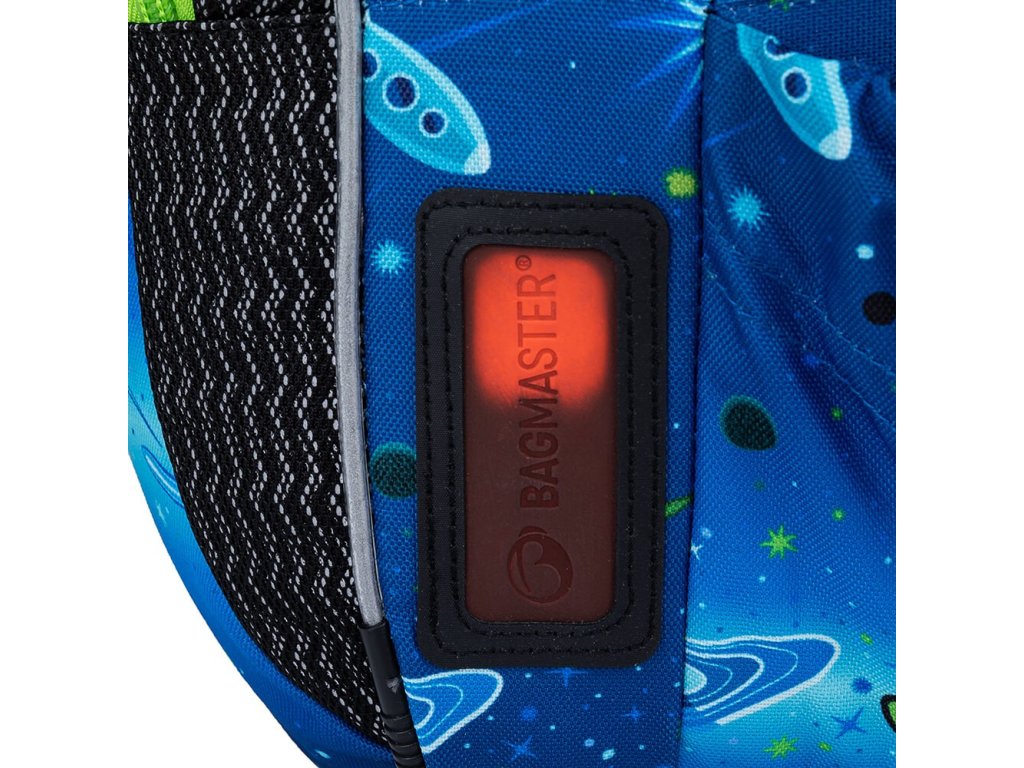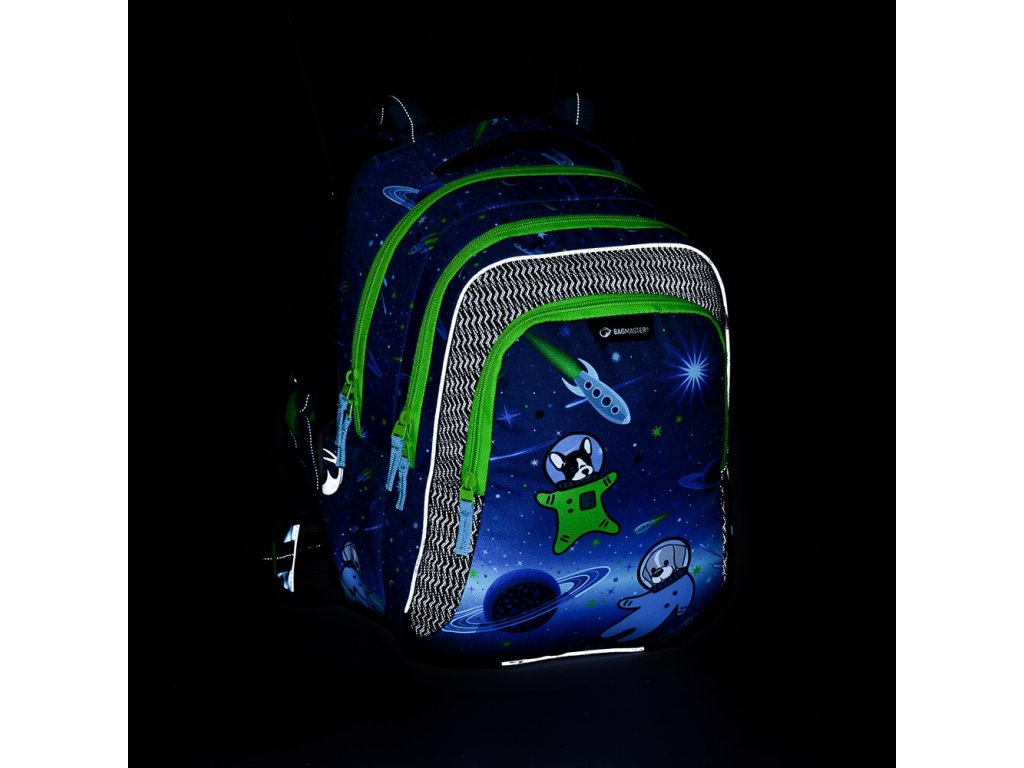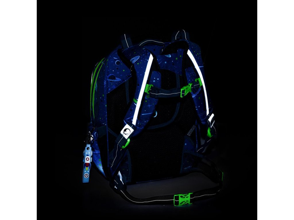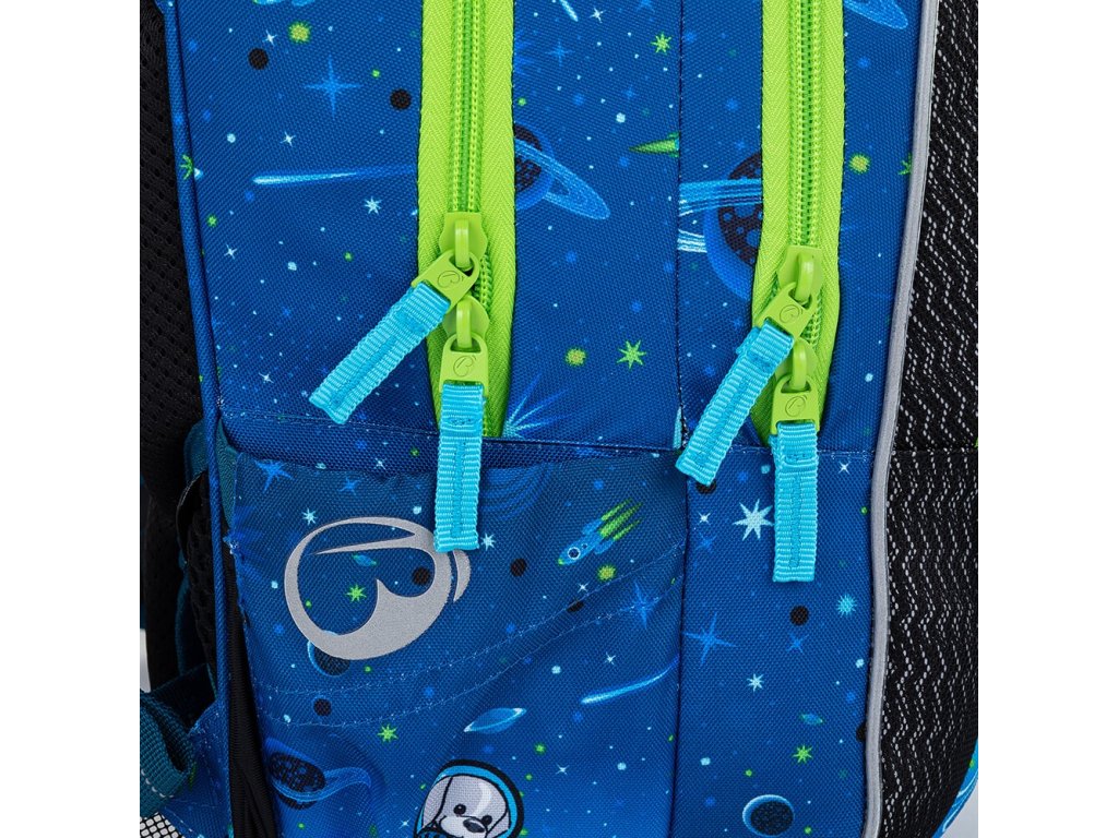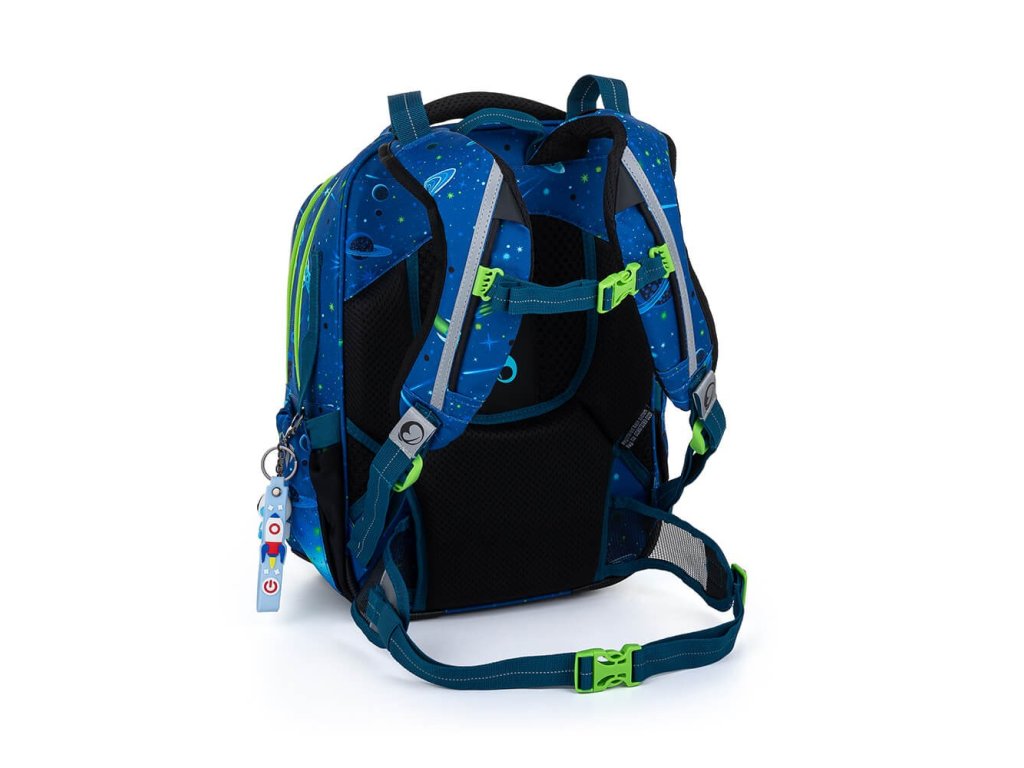 Tříkomorový školní superbatoh pro prvňáčky, kteří mají rádi zelenomodrou kombinaci a vesmírný svět. Váží necelý kilogram, má nový bezpečný zádový systém s bederním pásem, reflexní prvky, praktický organizér i boční kapsu na pití. Síťovina na anatomicky tvarovaných popruzích a zádové části je měkká a neškrábe.