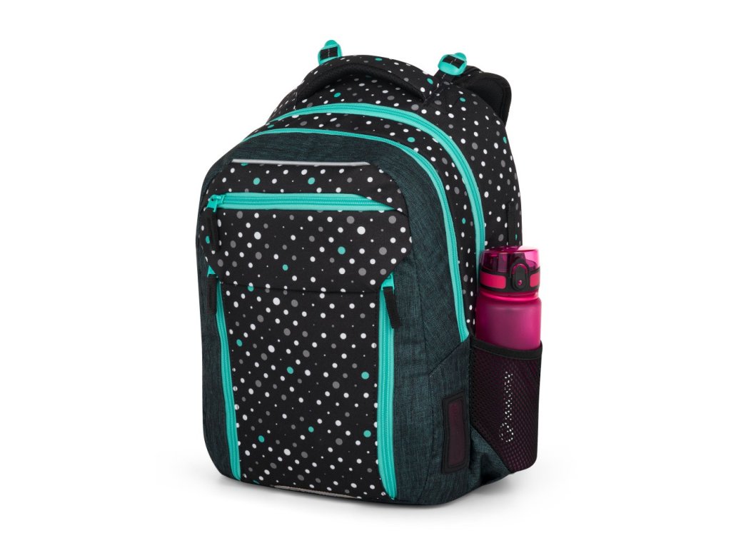 - Polstrované dno (vyrobené z 1680 D materiálu, zpevněné prýmkem a prošité) je pevné. Batoh je díky němu stabilní, učebnicím se v něm nemačkají rožky a hezky stojí u lavice.