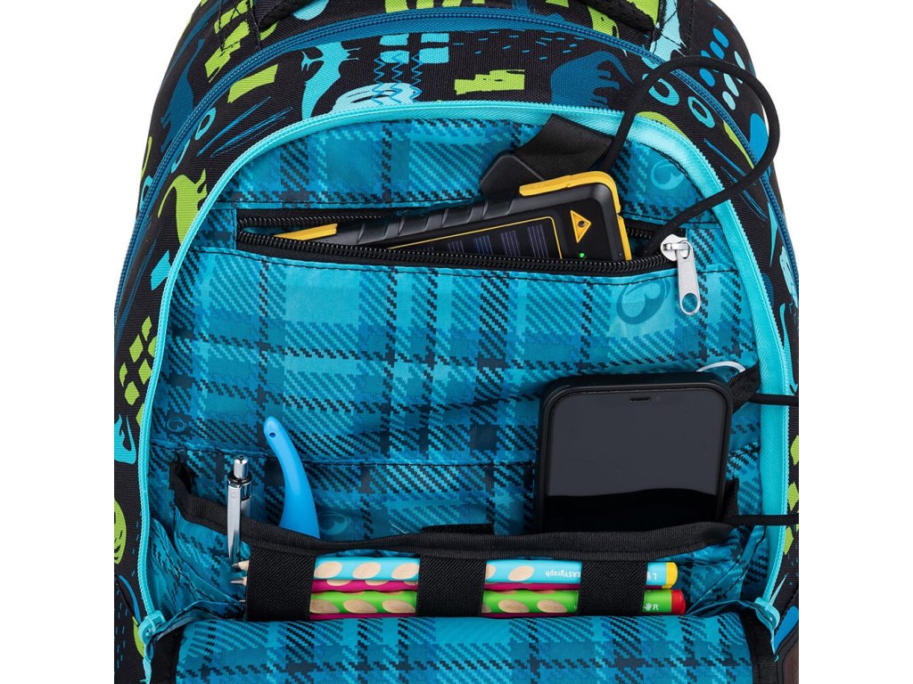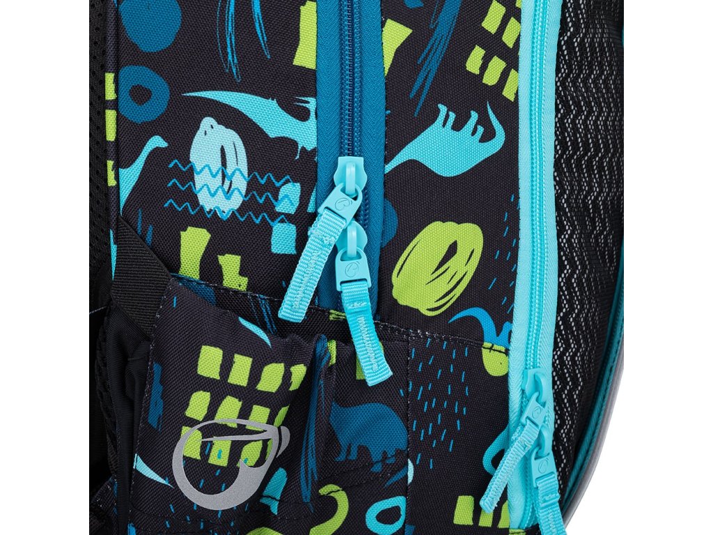 - Všechny kapsy a přihrádka v organizéru jsou zazipované. Školní pomůcky i cennosti tedy budou v bezpečí. Zipy mají nový odlehčený typ taháčků – nedrhnou, nerozepínají za chůze ani se nerozjíždí. Na zipech u obou hlavních komor jsou dva zipoví jezdci.