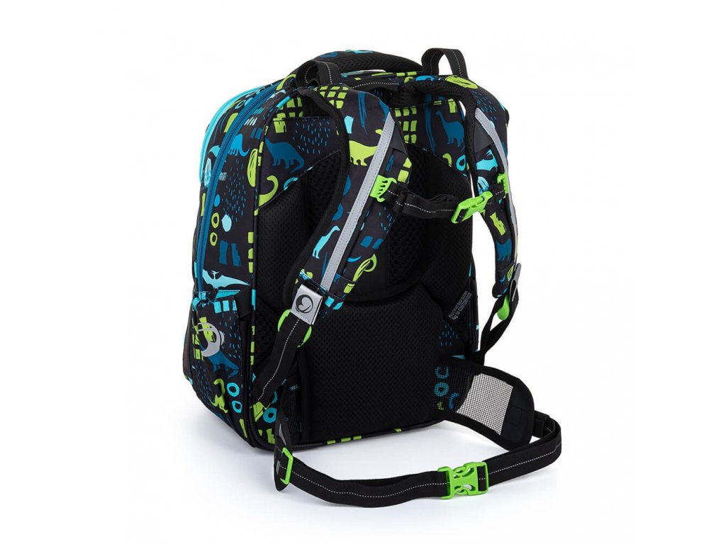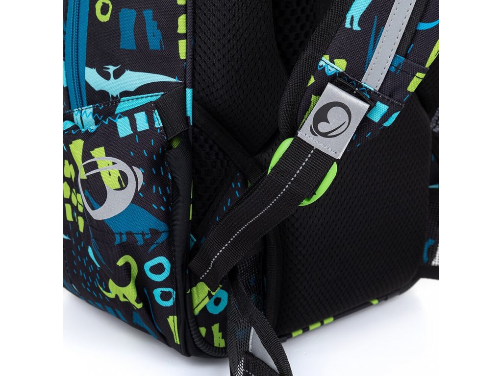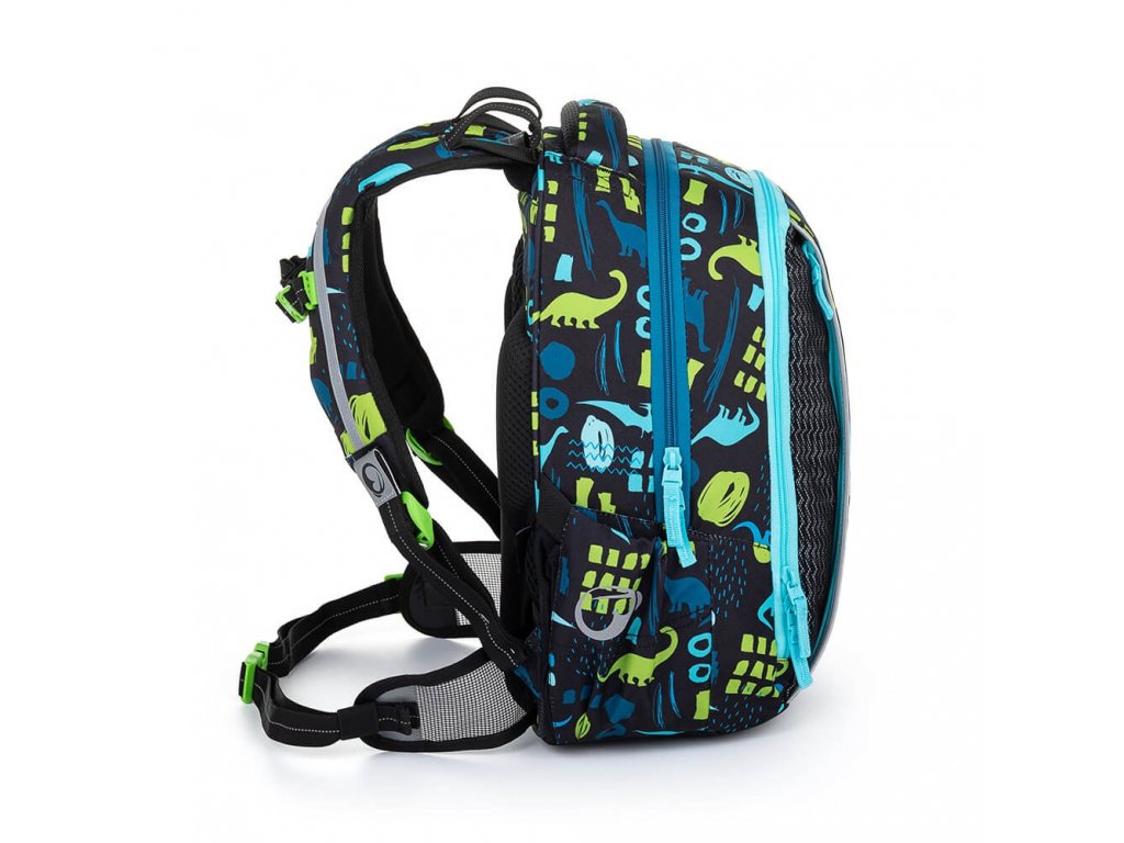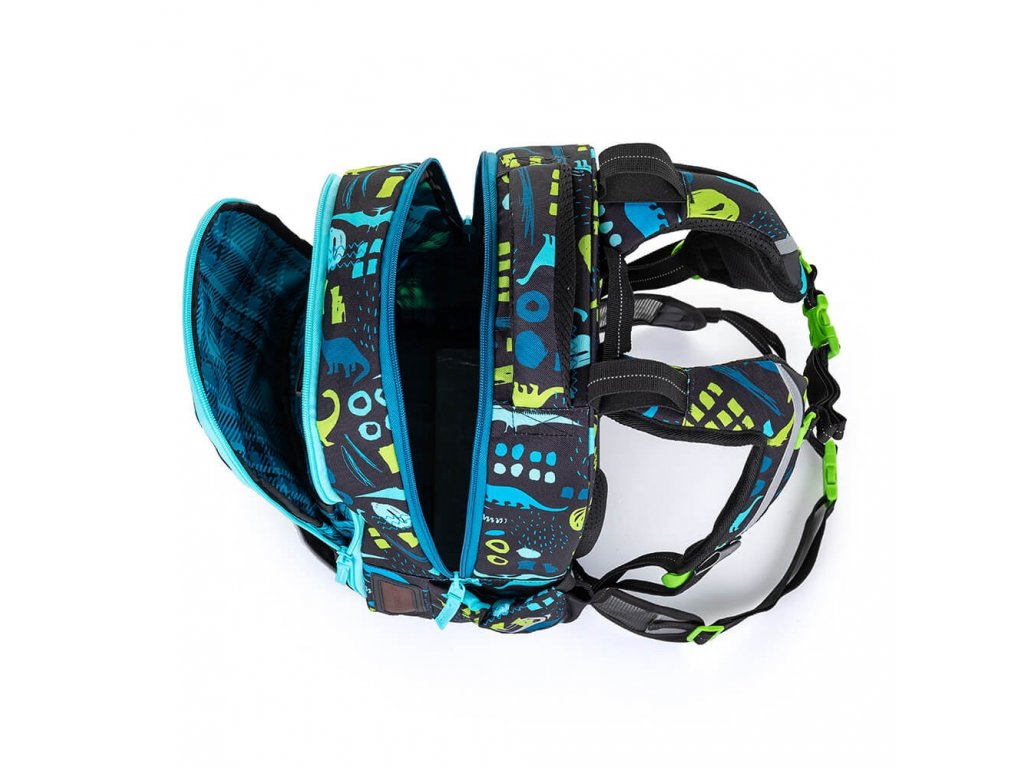 Dinosauří modro-zelený dvoukomorový batoh s bederním a hrudním pásem pro zdravá záda všech prvňáků, druháků a třeťáků. Vymakaný zádový systém je vhodný i pro školáky s malými rameny. Batoh má bezpečné reflexní prvky, organizér a pečlivě jsme otestovali, že se do něj vejdou všechny učebnice a pomůcky.