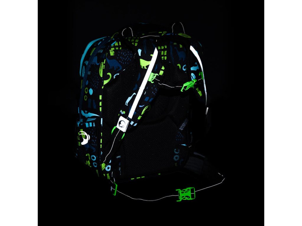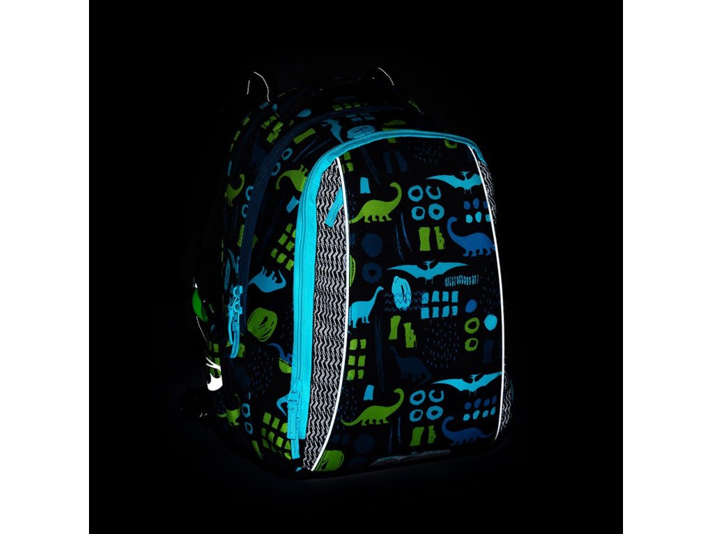 - Do dinosauřího designu batohu jsou nenápadně zakomponovány reflexní prvky a reflexní látka pod síťovinou. Výrazně se rozsvítí ve tmě – přesvědčíte se tak, že jej vyfotíte bleskem.
