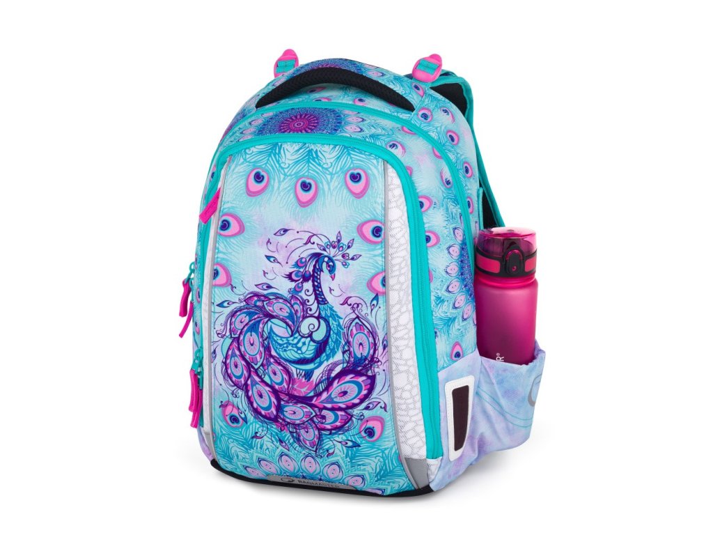 - Podstava batohu je vyrobena z pevného, hustě tkaného a odolného materiálu. Spolu s komorami batohu tvoří pevný krunýř, ve kterém se učebnicím nebudou mačkat rožky ani sesouvat obaly.