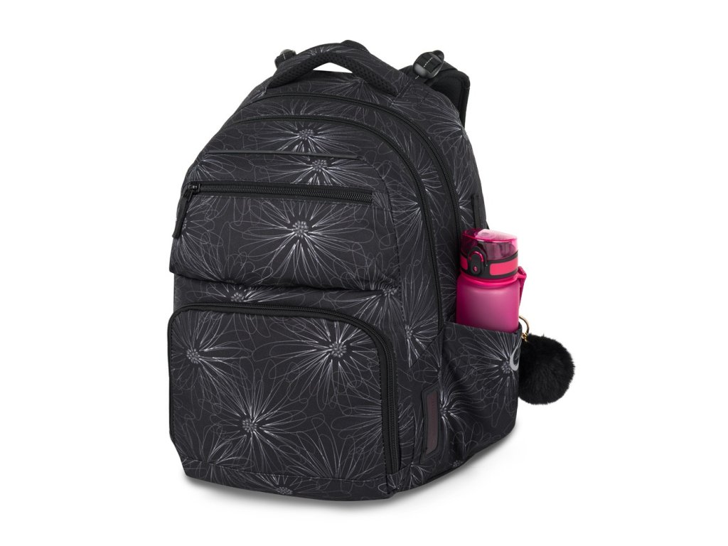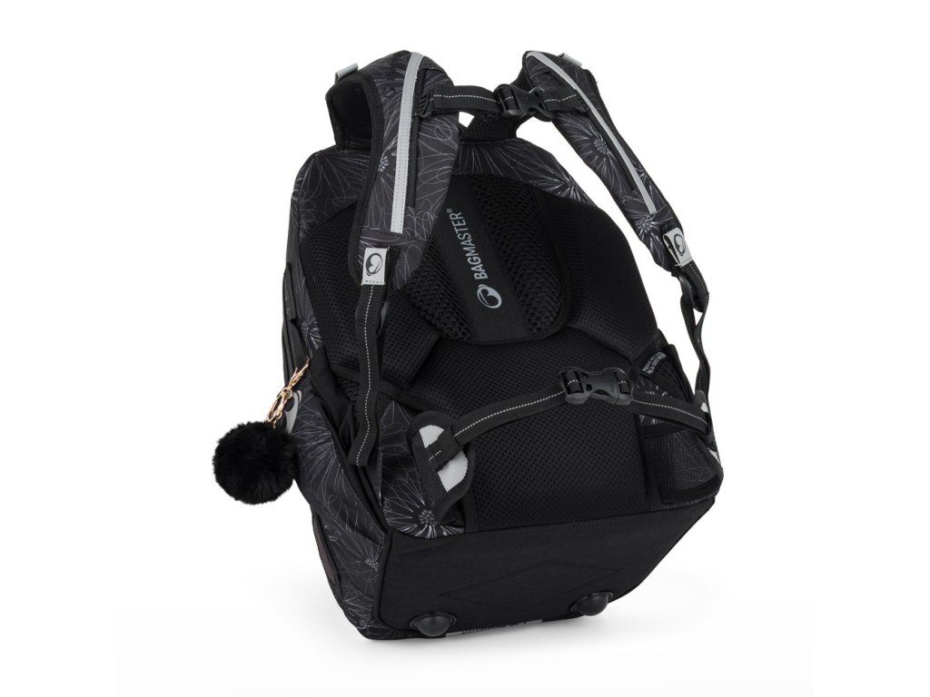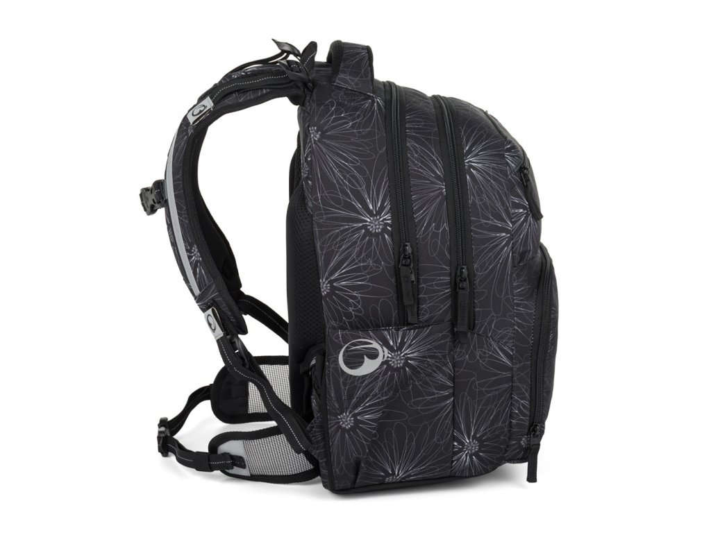 - Polstrované dno (vyrobené z 1680 D materiálu, zpevněné prýmkem a prošité) je pevné. Batoh je díky němu stabilní, učebnicím se v něm nemačkají rožky a hezky stojí u lavice.