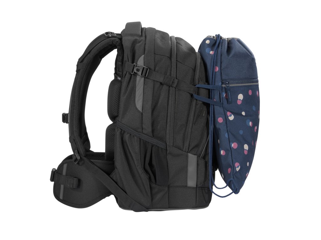 - 2 upevňovací pásky na přední straně batohu pro upevnění např. skateboardu, bundy nebo helmy nebo reflexních pásků