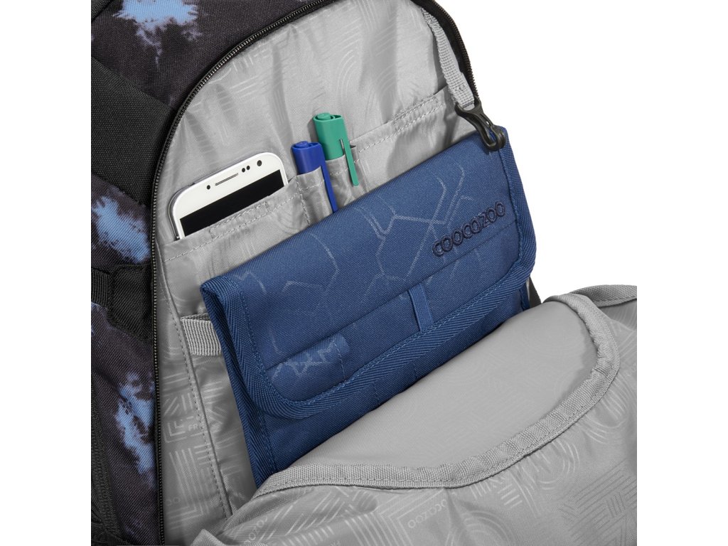 kapsa s organizérem na doklady, psací potřeby, karabinka na klíče a prostorná přední kapsa např. na svačinový box
