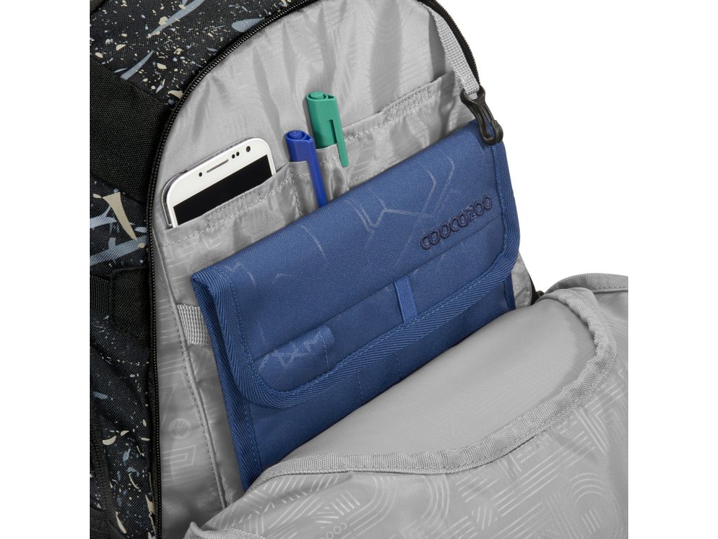 kapsa s organizérem na doklady, psací potřeby, karabinka na klíče a prostorná přední kapsa např. na svačinový box