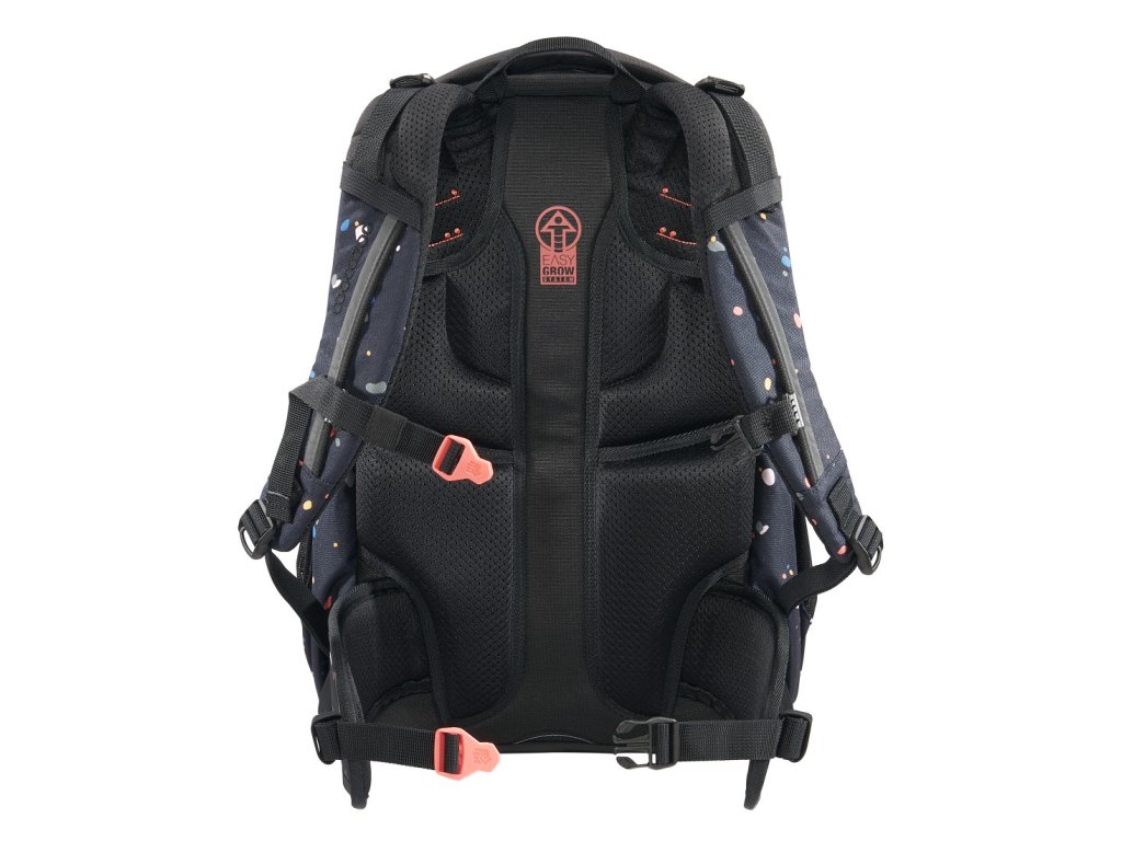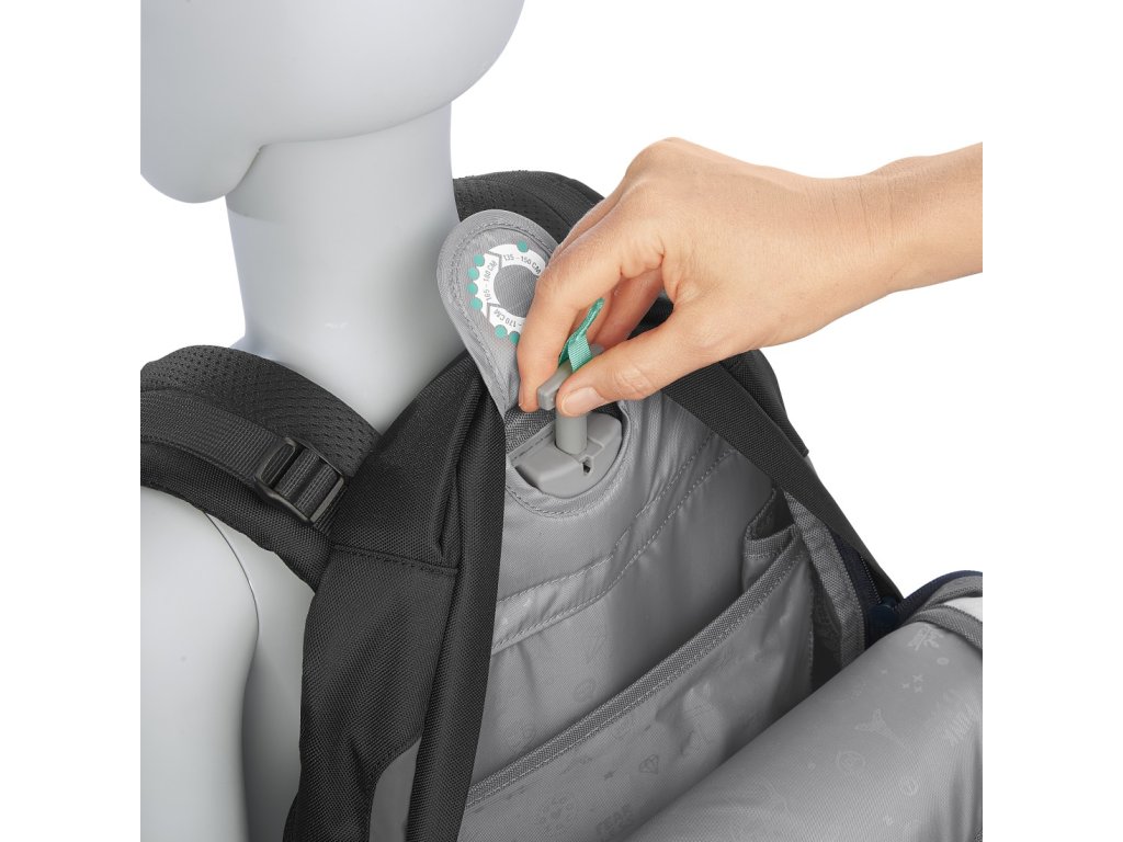 - možnost plynulého výškového nastavení ramenních popruhů pomocí otočného mechanismu uvnitř aktovky zajišťuje