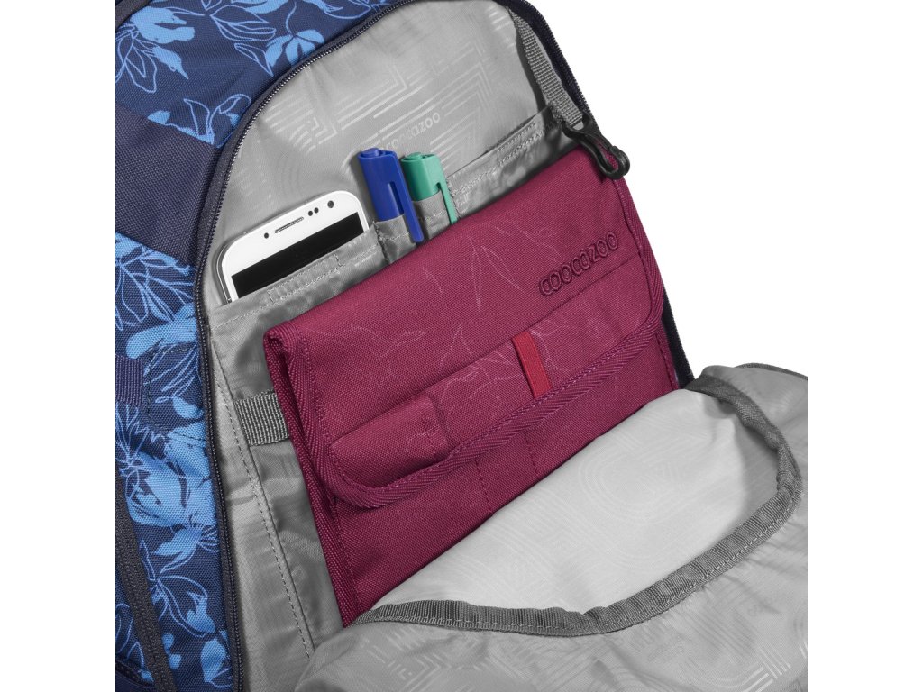 kapsa s organizérem na doklady, psací potřeby, karabinka na klíče a prostorná přední kapsa např. na svačinový box