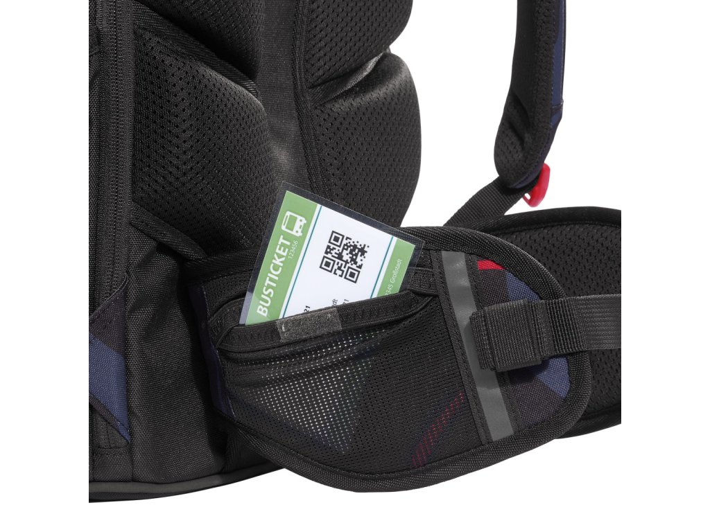 kapsa s organizérem na doklady, psací potřeby, karabinka na klíče a prostorná přední kapsa např. na svačinový box, malá