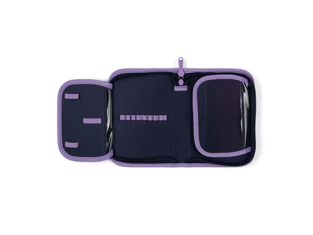 Penál: Jednopatrový školní penál s 2 chlopněmi, prázdný obsahuje 25 gumových poutek pro uchycení psacích potřeb. Na vnitřních chlopních jsou průhledné fólie pro rozvrh hodin.