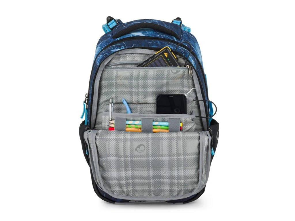 Batoh váží pouze 0,94 kg, takže nezatěžuje dětská záda. Přitom nabízí dostatek místa pro učebnice, sešity i další školní potřeby.