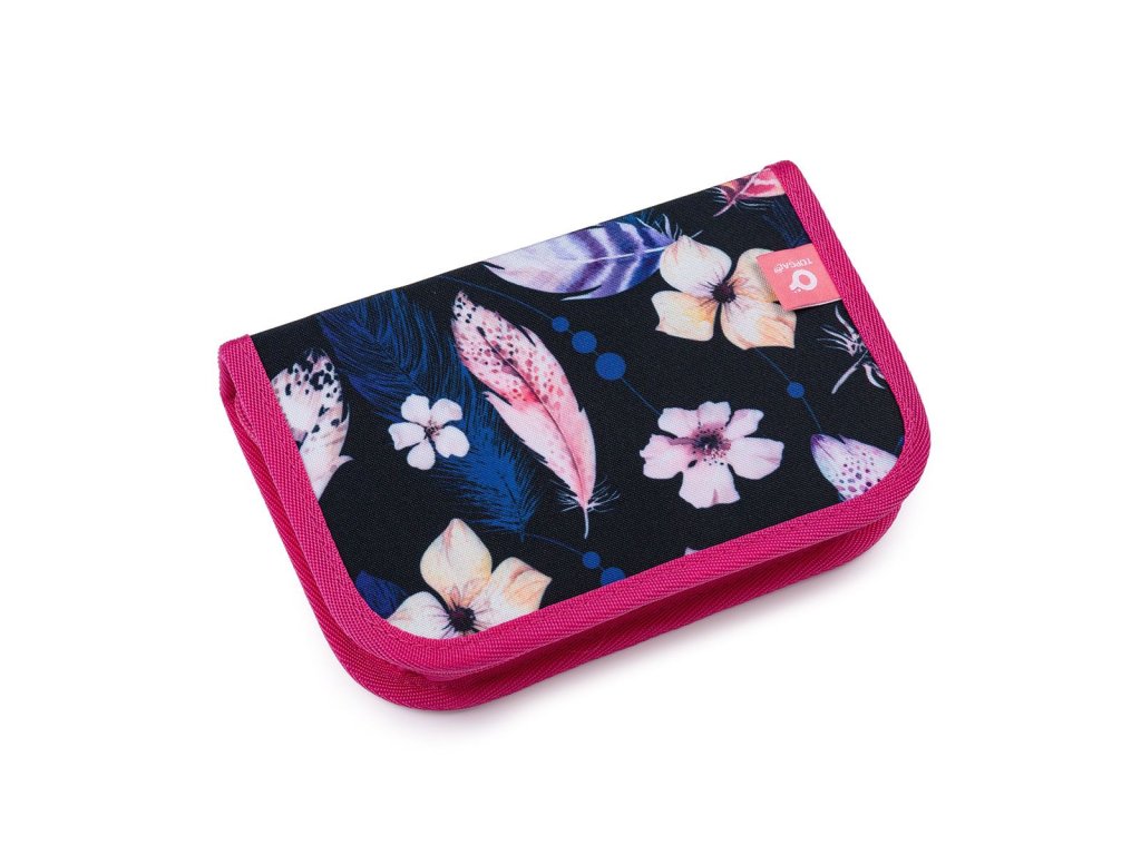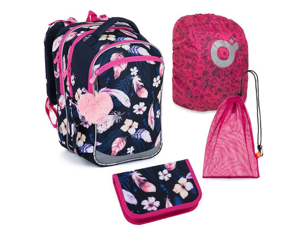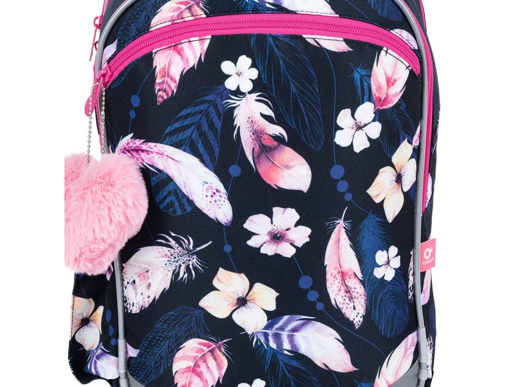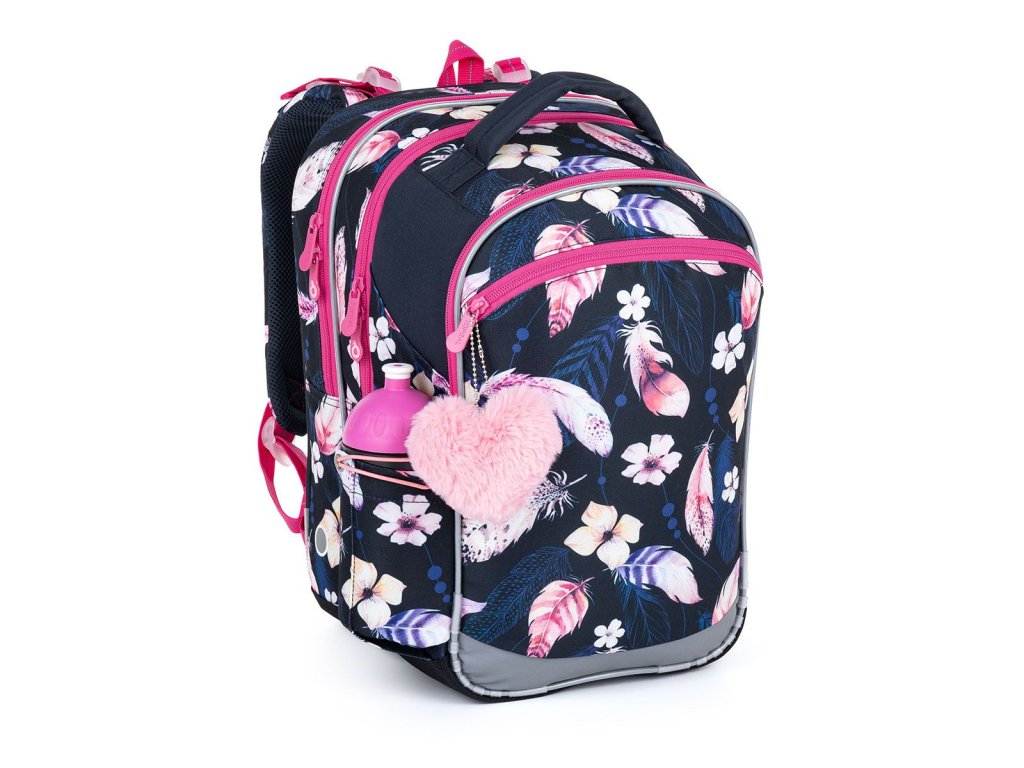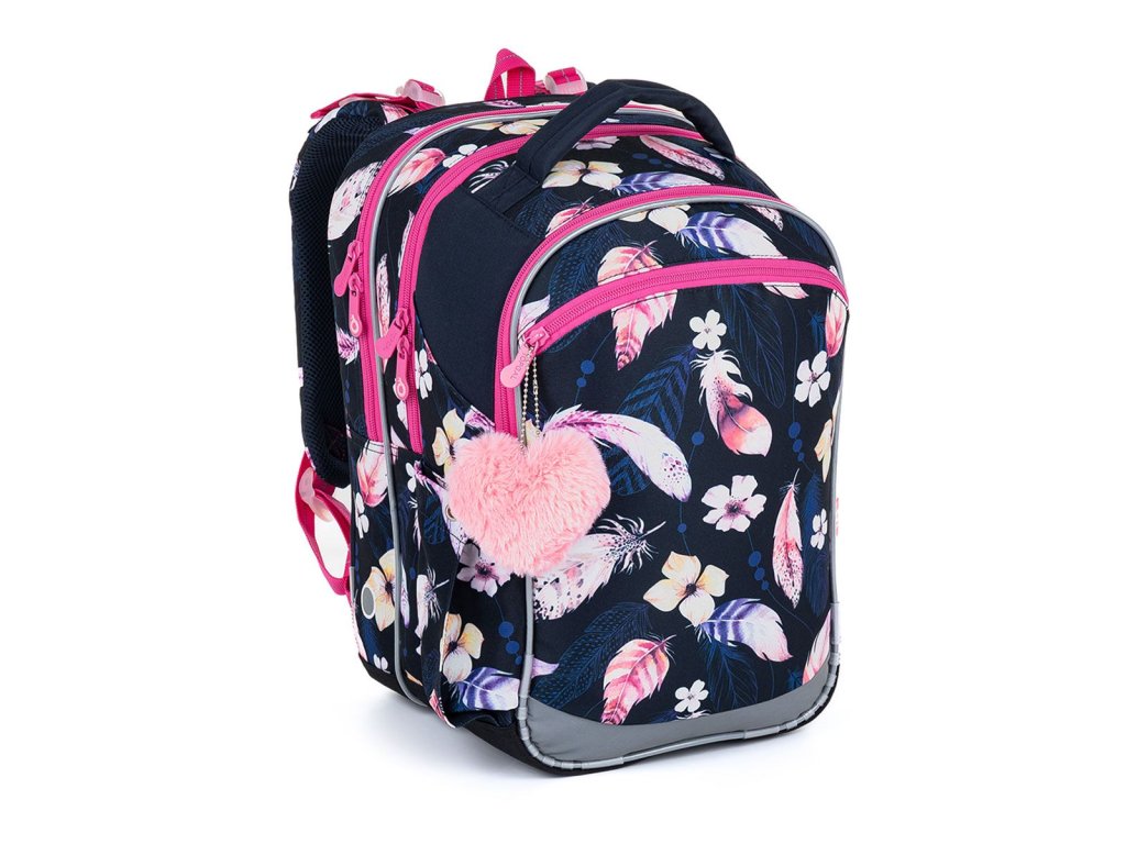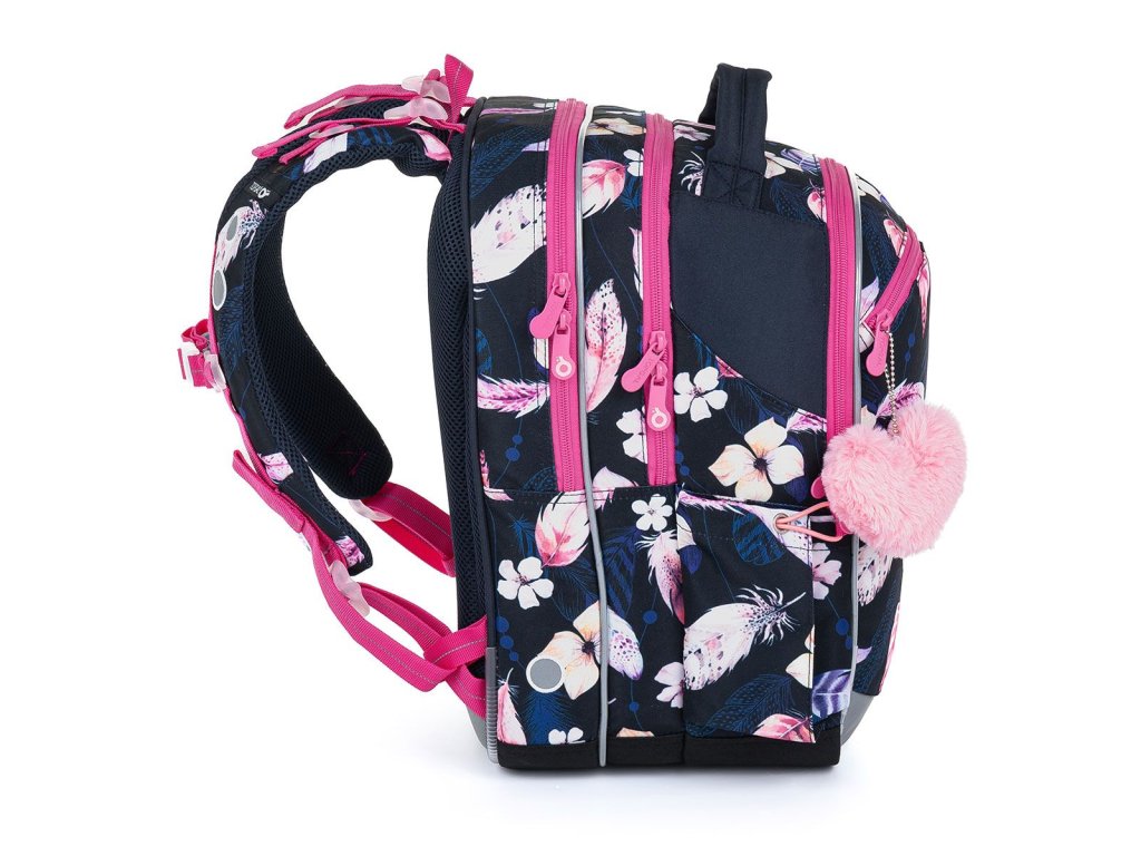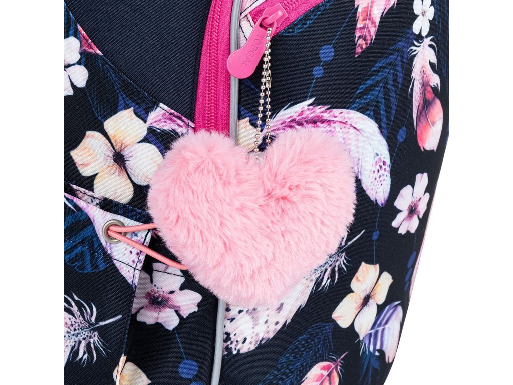 Tmavomodrý tříkomorový batoh s peříčky, růžovými zipy a plyšovým přívěskem ve tvaru srdce, se stane skvělým společníkem do první až páté třídy.