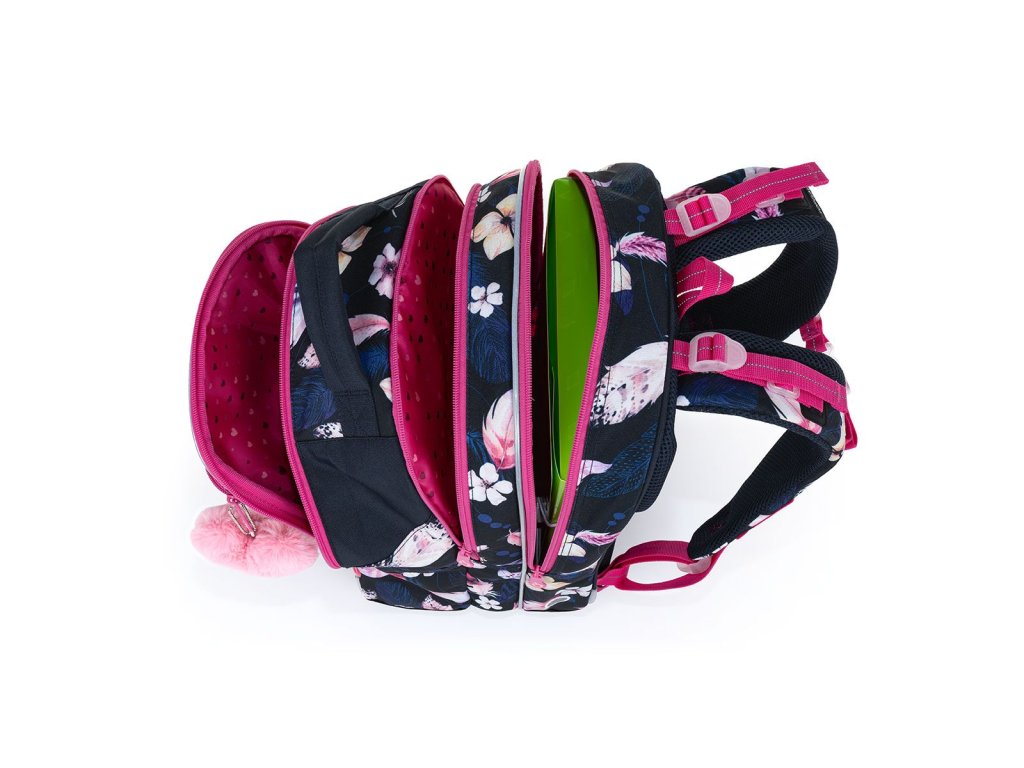 Tříkomorový model COCO je oblíbeným střihem drobných slečen v první třídě, ale i školaček ve vyšších ročnících prvního stupně ZŠ. Batoh je lehký jako pírko a v kombinaci s květinkami udělá hodně parády.