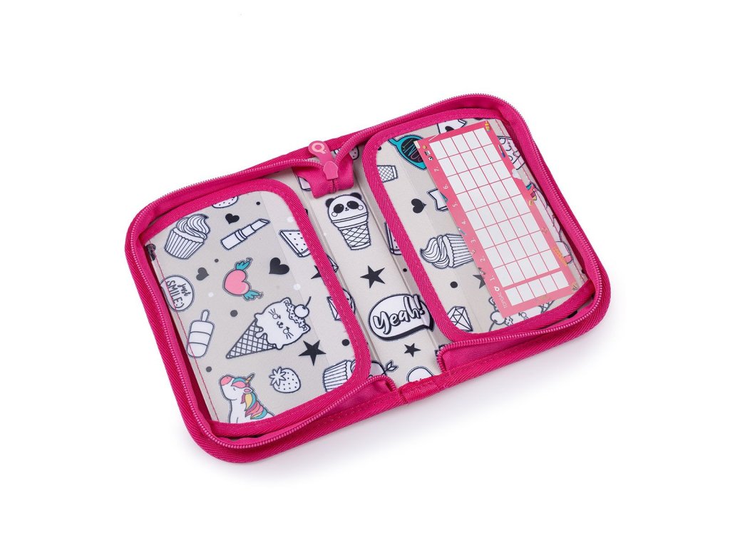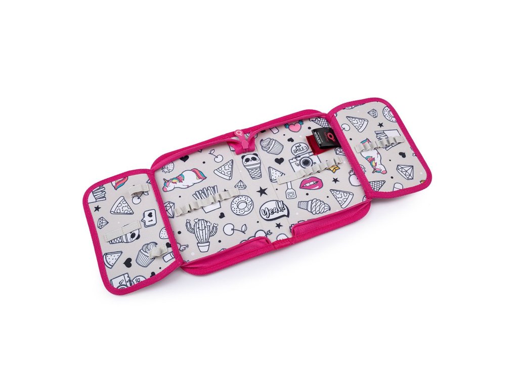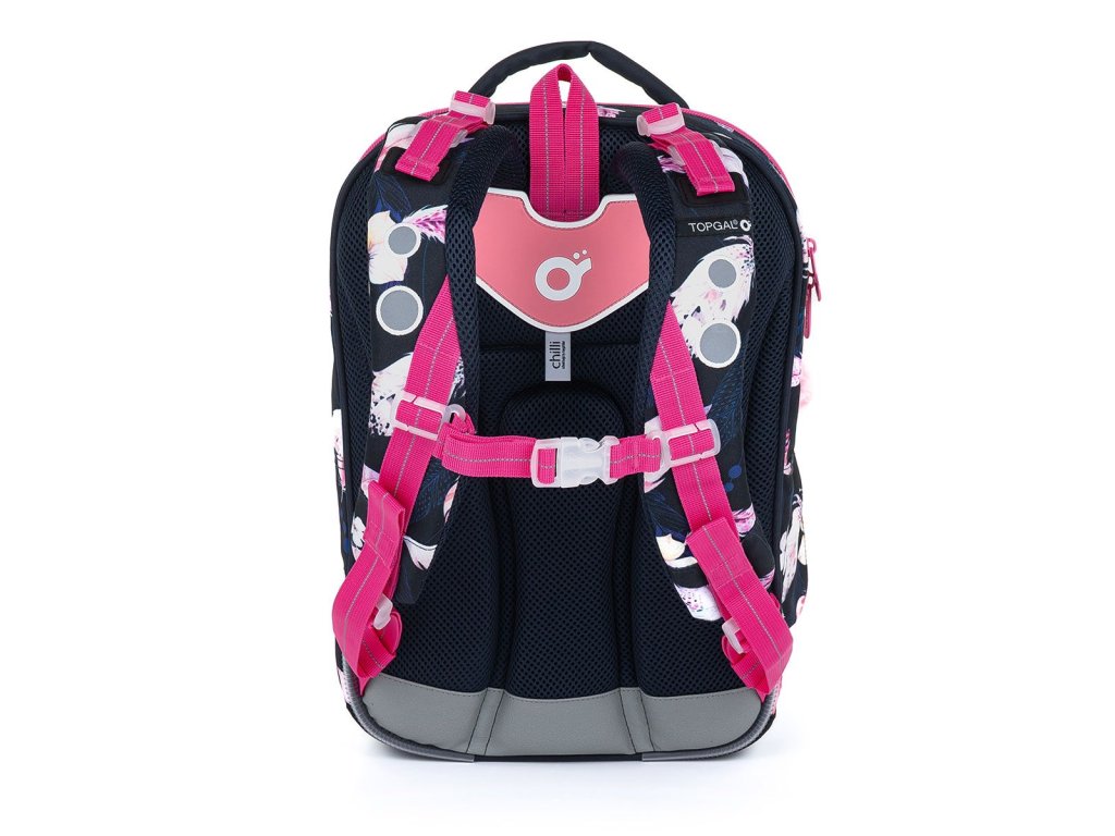 Batoh má tři objemné komory. Zadní komora je širší - doporučujeme k zádům dávat nejtěžší učebnice nebo desky na sešity. Přední komora je o něco užší a je v ní umístěna ještě malá síťová kapsa na zip a jmenovka.
