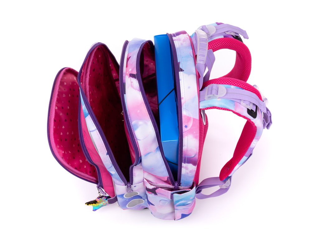 Batoh má dvě objemné hlavní komory. Zadní komora je širší - doporučujeme k zádům dávat nejtěžší učebnice nebo desky na sešity. Přední komora je o něco užší a je v ní umístěna ještě malá síťová kapsa na zip a jmenovka.