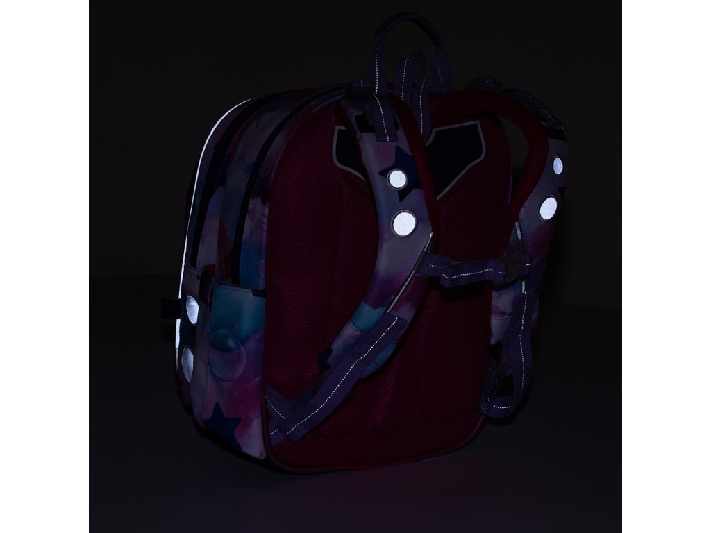 I malí školáci musejí být vidět, zvláště v zimním období, proto jsme batoh opatřili řadou reflexních prvků. Najdete je na čele batohu, kde jsou i v lemovkách přední kapsičky a přední komory, na boku batohu, ale i na ramenních popruzích.