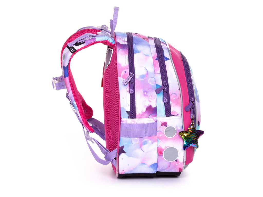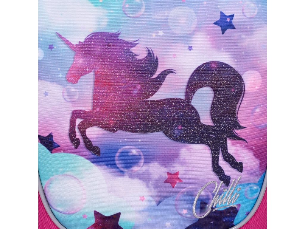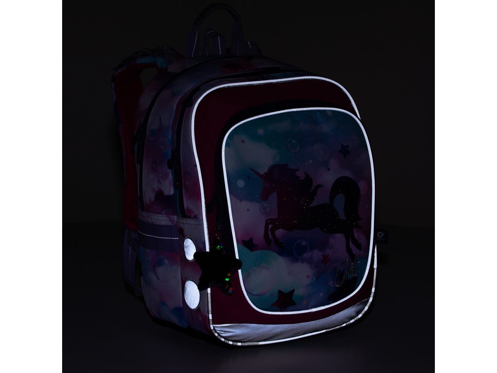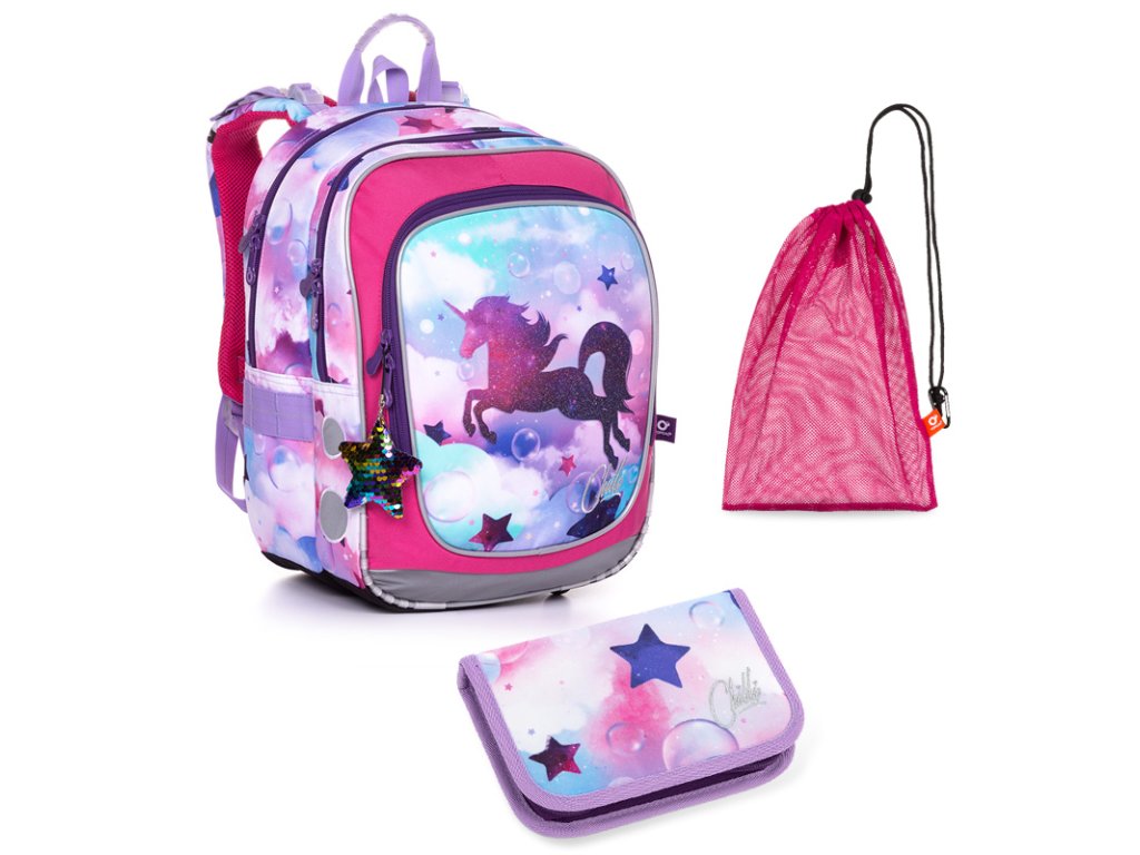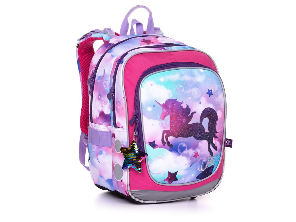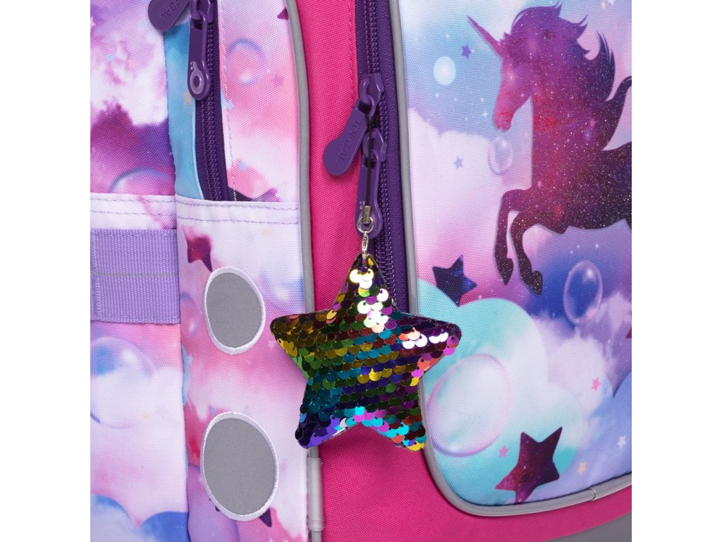 Jednorožec, přívěsek, hvězdičky, bublinky, prostě snová atmosféra na lehounkém batohu pro vaše malé drobné školačky v první až třetí třídě ZŠ.