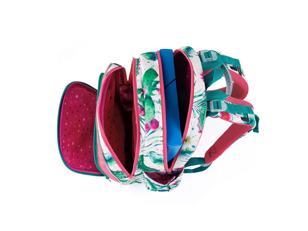 Dvě hlavní komory doplňuje na čele batohu hluboká kapsa. Zadní komora je hlubší, dejte do ní ty nejtěžší slabikáře a učebnice. Přední komora je o něco užší, ideální je dát do ní třeba penál PENN 21002 a další drobné školní potřeby. Malé deníčky a drobnosti dejte do síťové kapsy na zip uvnitř přední komory. Nad ní je ještě jmenovka, aby se více stejných batohů ve třídě nepletlo. Přední kapsa je dost hluboká, můžete ji použít třeba na přenášení svačinky v krabičce ZOLA. Uvnitř kapsy je i odnímatelná karabina na klíče.