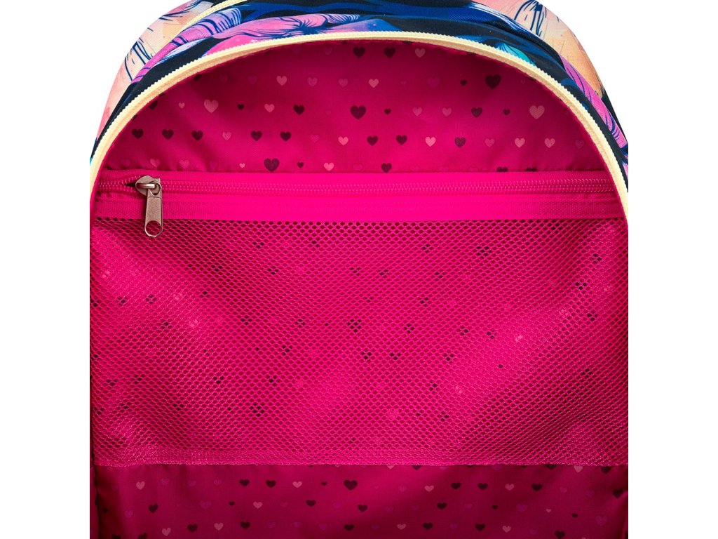 Zadní komora batohu je užší. Je ideální na přenášení nejtěžších učebnic nebo desek na sešity. Přední komora je nejširší a najdete v ní praktickou síťovou kapsičku na zip. Hluboká kapsa mezi přední komorou a kapsou na čele batohu má užší vstup, skvěle se hodí pro penál PENN 24008 ve stejném designu.