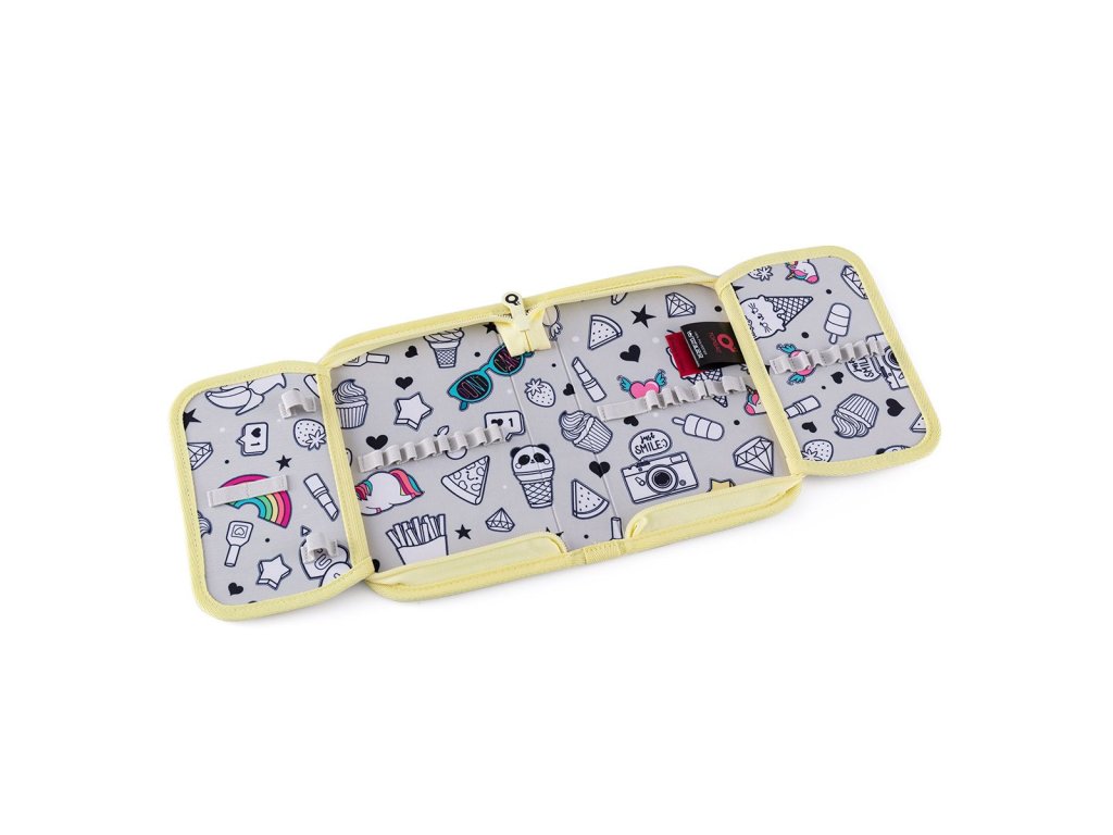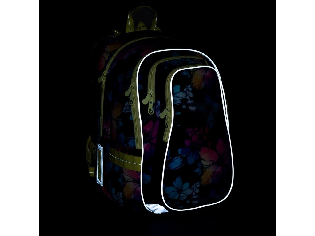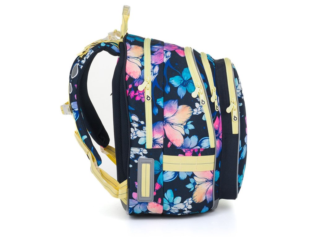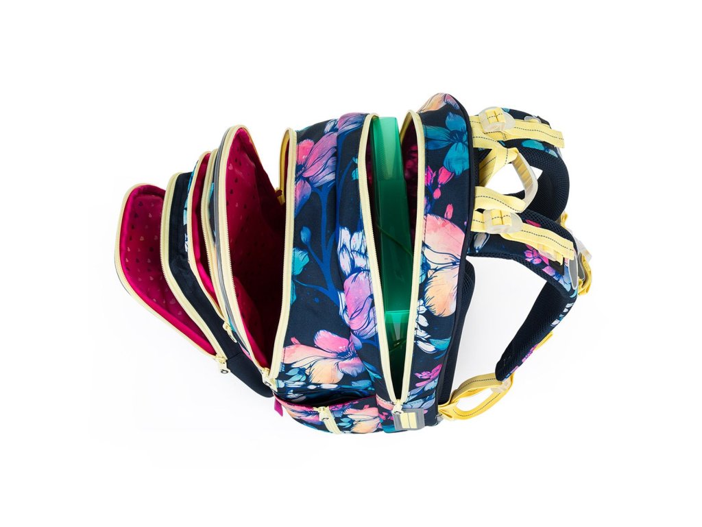Dvoukomorový model LYNN patří k nejobjemnějším střihům v naší nabídce. Žluté zipy ladí s květy duhových barev.