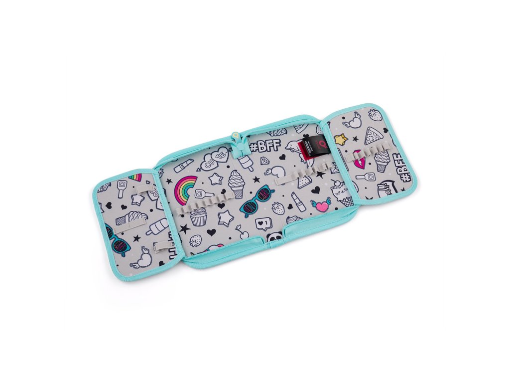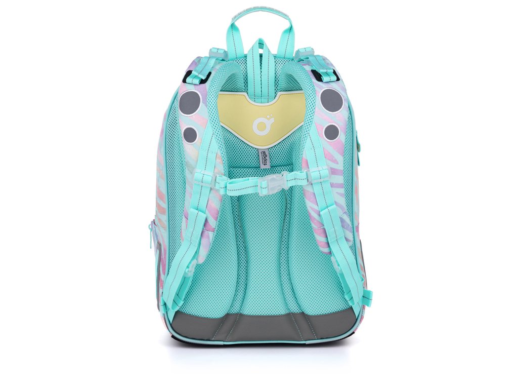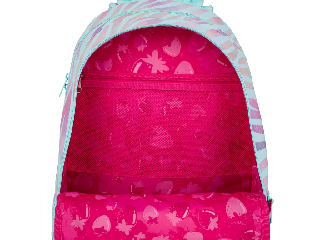 Zadní komora batohu je ideální na přenášení nejtěžších učebnic. Do přední komory jsme přidali praktickou síťovou kapsičku na zip, třeba na doklady. Hluboká kapsa mezi přední komorou a kapsou na čele batohu má užší vstup, proto se skvěle hodí pro ve stejném designu .