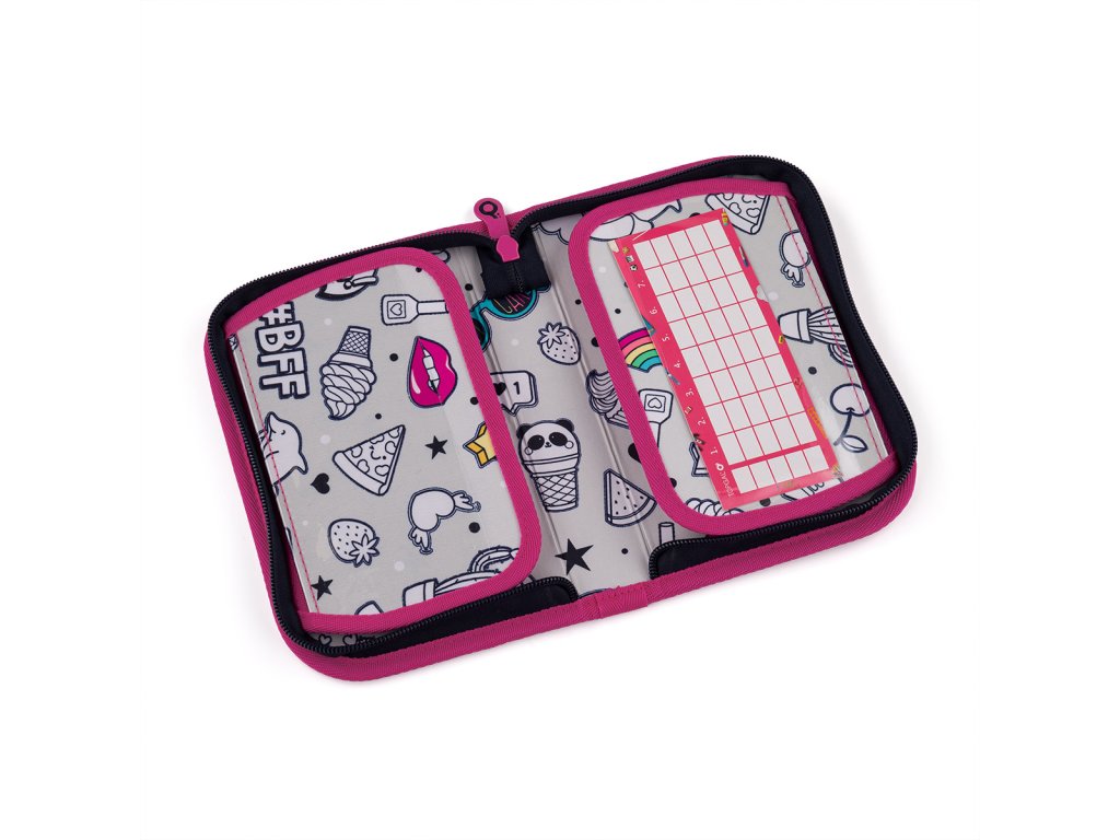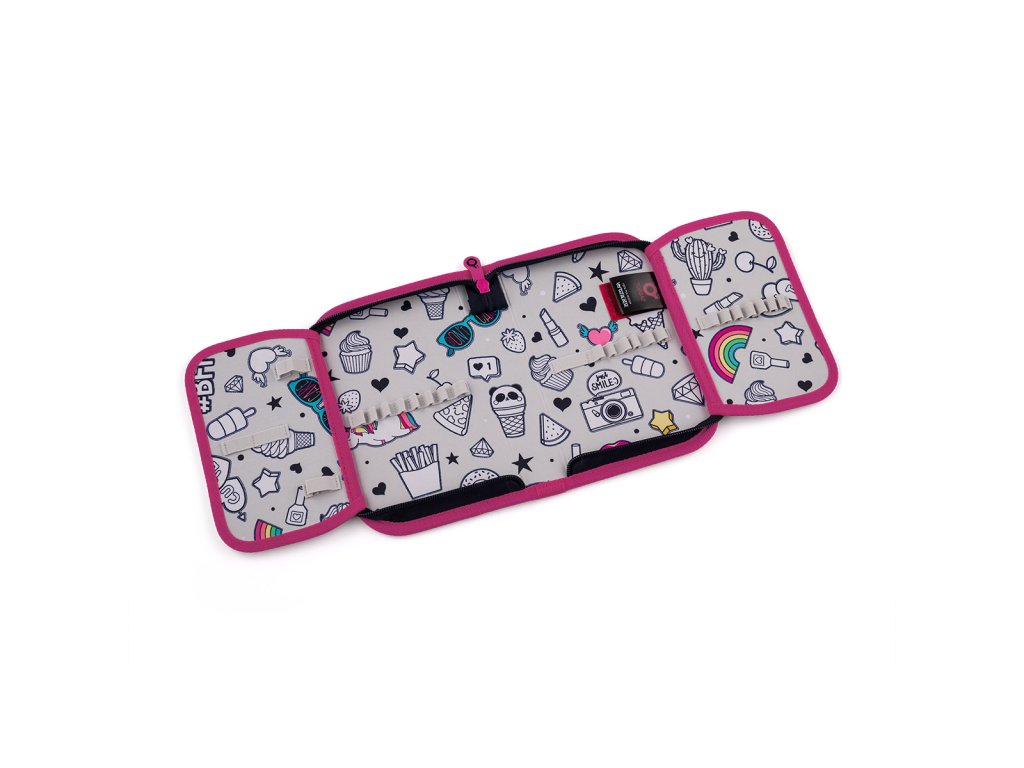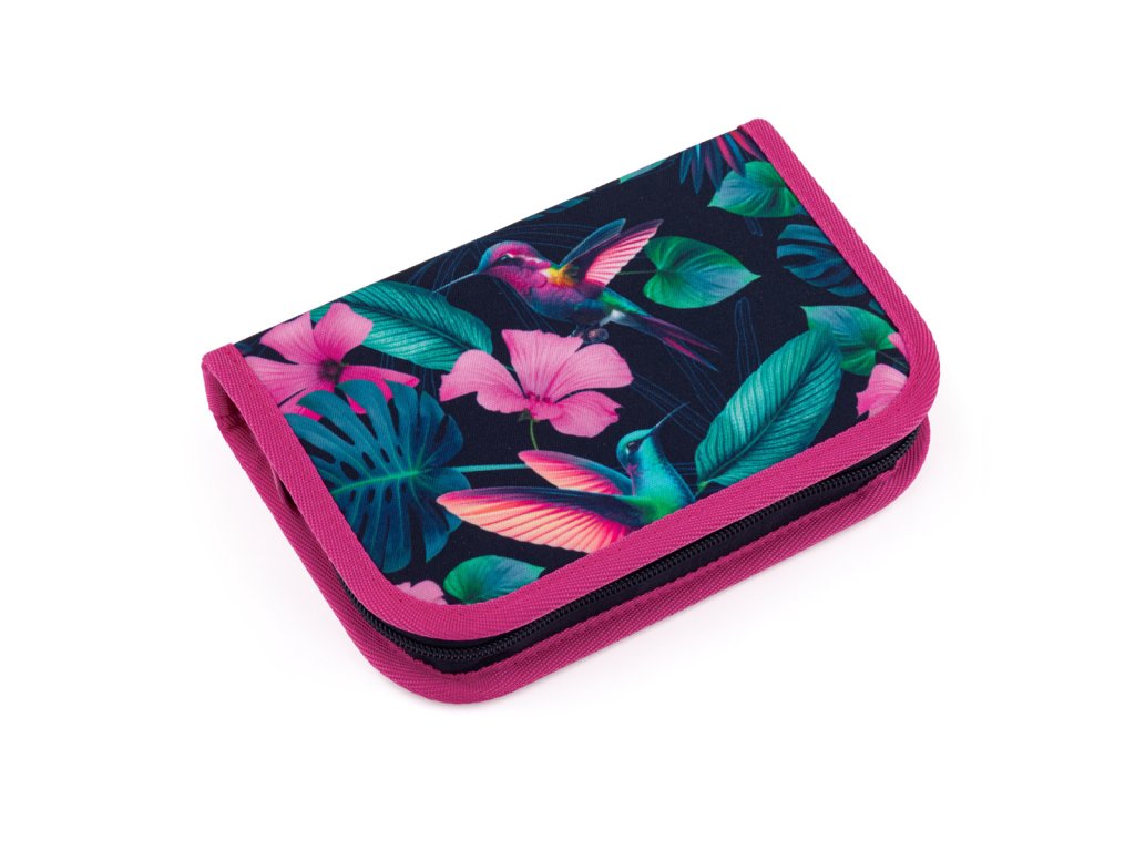 Jednopatrové školní pouzdro se dvěma klopami. Díky gumovým úchytům se do nich vejde celkem dvacetjedna pastelek, tužek a fixek. Tři širší úchyty poslouží na pravítko, kružítko či nůžky. Dva větší na gumu a ořezávátko.