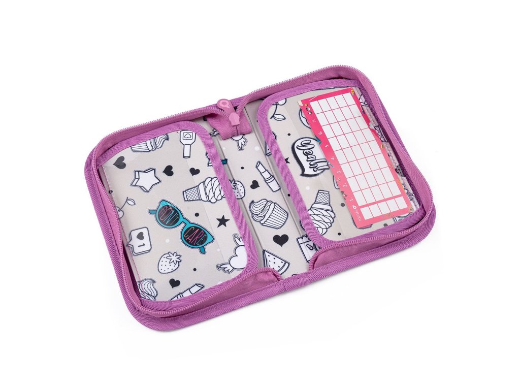 Batoh má dvě objemné hlavní komory. Zadní komora je objemnější a spolehlivě pojme všechno učení. Přední komora je o něco užší a je v ní umístěna ještě malá síťová kapsa na zip a jmenovka. Přední hluboká kapsa pojme např. penál PENN 23004 ve stejném designu nebo krabičku na svačinku. Do bočních kapes se vejdou lahvičky o objemu 0,5 litru, např. naše ZIVA.