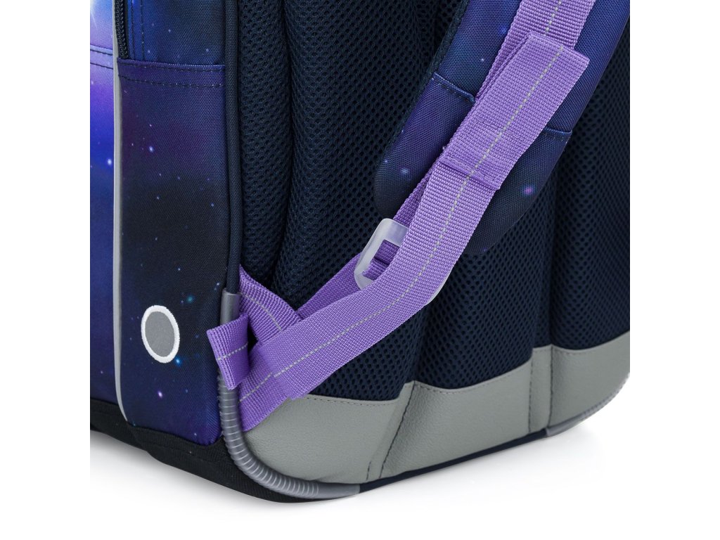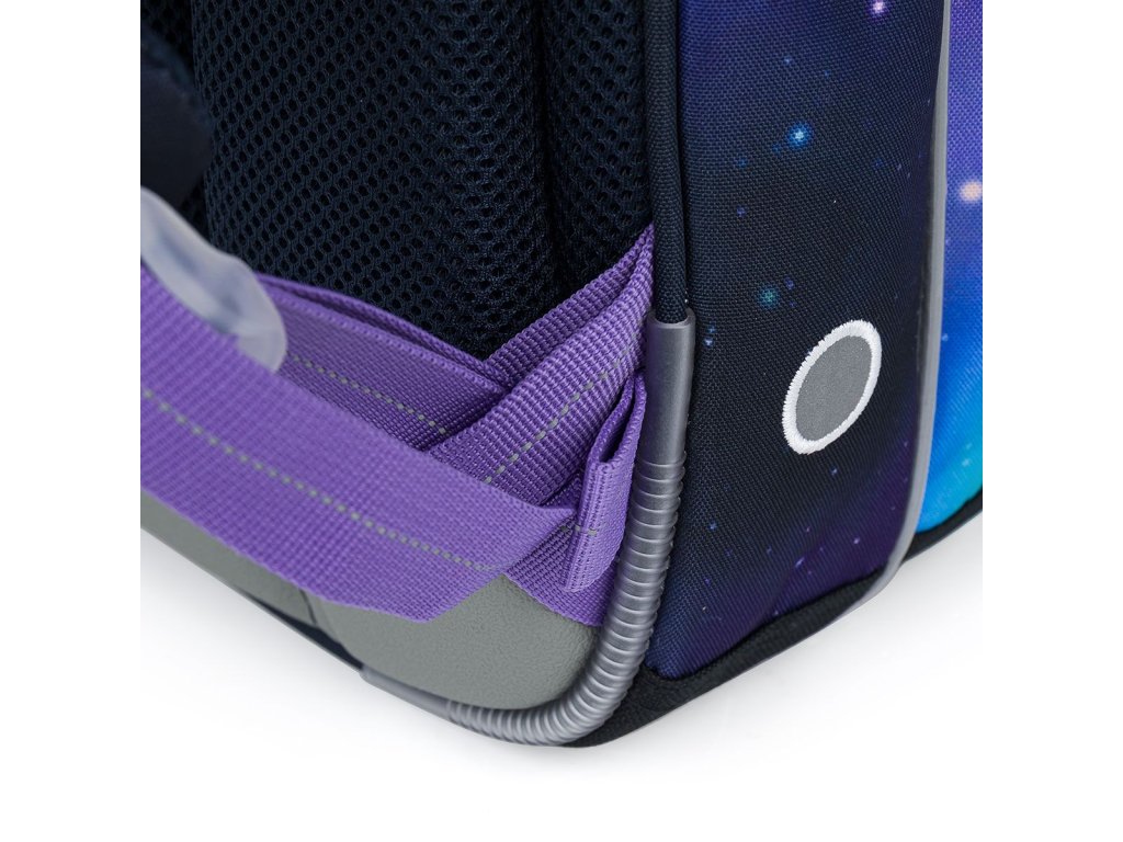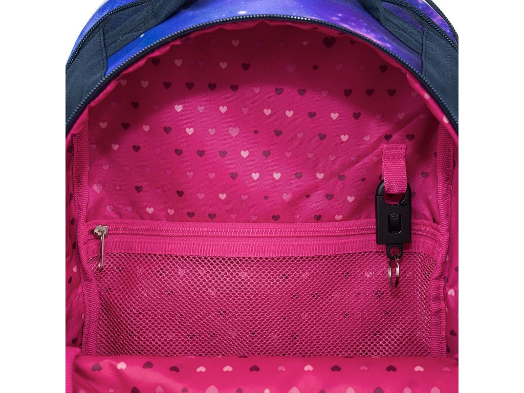 Zadní komora je nejširší, sem doporučujeme dát nejtěžší učebnice nebo desky na sešity. Přední komora je o něco užší a je v ní umístěna ještě malá síťová kapsa na zip a jmenovka.