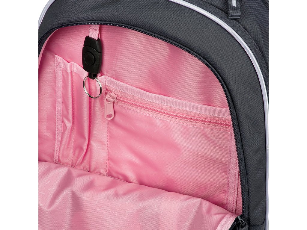 Batoh má tři samostatné komory, přehledný organizér a polstrovanou kapsu na notebook do velikosti 15". Nechybí ani praktická termokapsa na svačinu.