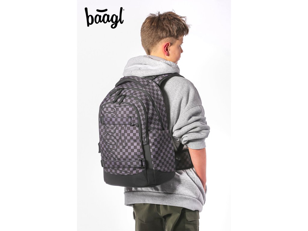 Školní batoh Baagl Skate Max – Ska šedý (31 l, 1 150 g, 3 komory, 4 velikosti zad, EVA výztuž, bederní pás, popruhy na skateboard, kapsa na notebook, YKK, reflexní prvky)
