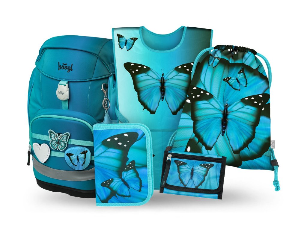 🦋 Školní set pro prvňáčky Baagl Airy Plus Butterfly II je kompletní pětidílná školní výbava pro děti od 1. třídy základní školy. Modrý design s motivem motýlků potěší všechny malé školačky a jednotlivé doplňky jsou sladěné do stejného stylu.