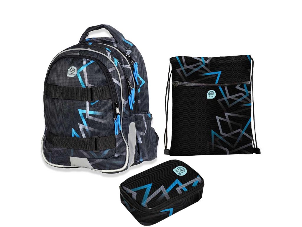 Školní set s odlehčeným chlapeckým batohem do školy značky Ulitaa Geometrik, který díky své propracované ergonomii sedí na zádech většině dětem s výškou 134 až 152 cm. Batoh je vhodný pro 3., 4. a 5. třídu ZŠ. Set obsahuje školní tašku, vak a penál stejného motivu. Školní batohy Ulitaa jsou vyrobeny v ČR a mají český design ověřený dětmi.