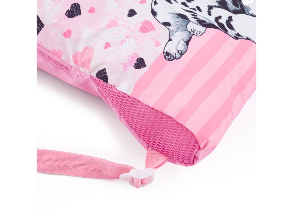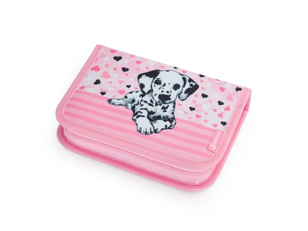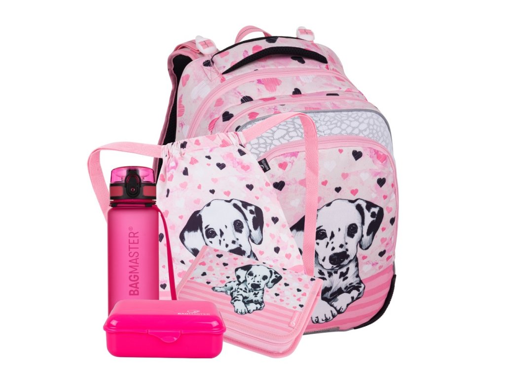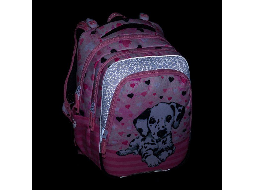 Batoh pro malé školačky od 1. do 3. třídy s dalmatinem. Zaujme nejen svým designem, ale také lehkostí – váží pouhých 0,98 kg. Uvnitř jsou tři velké komory a organizér na cennosti. Batoh s motivem dalmatina stojí na plastových nožkách, ve tmě chrání svými reflexními prvky. Zádový systém s hrudním pásem a bederním pásem má zdravotní posudek. K batohu bude školačce ladit penál na psací potřeby, látkový vak na přezůvky a svačinový set.