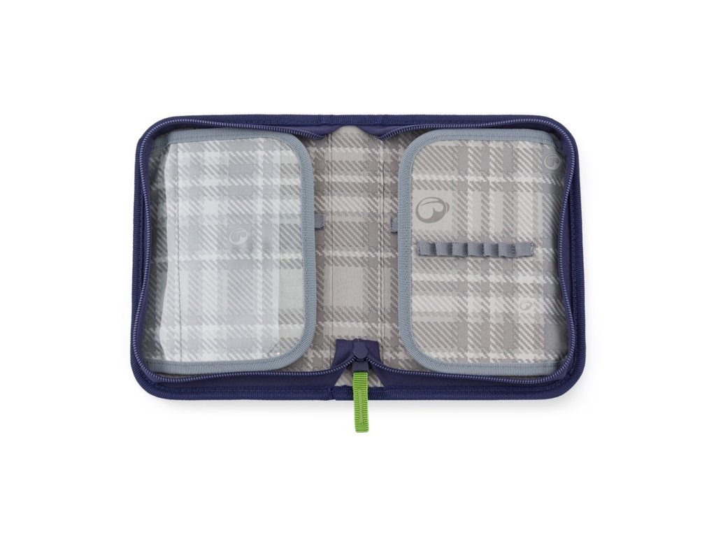 - Do kapsičky na zip se vejde power banka. Nabíjecí kabel stačí otevřeným rožkem protáhnout k telefonu umístěnému v organizéru.