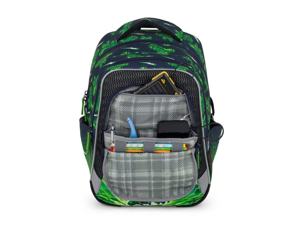 - Podstava batohu je vyrobena z pevného, hustě tkaného a odolného materiálu. Spolu s komorami batohu tvoří pevný krunýř, ve kterém se učebnicím nebudou mačkat rožky ani sesouvat obaly.