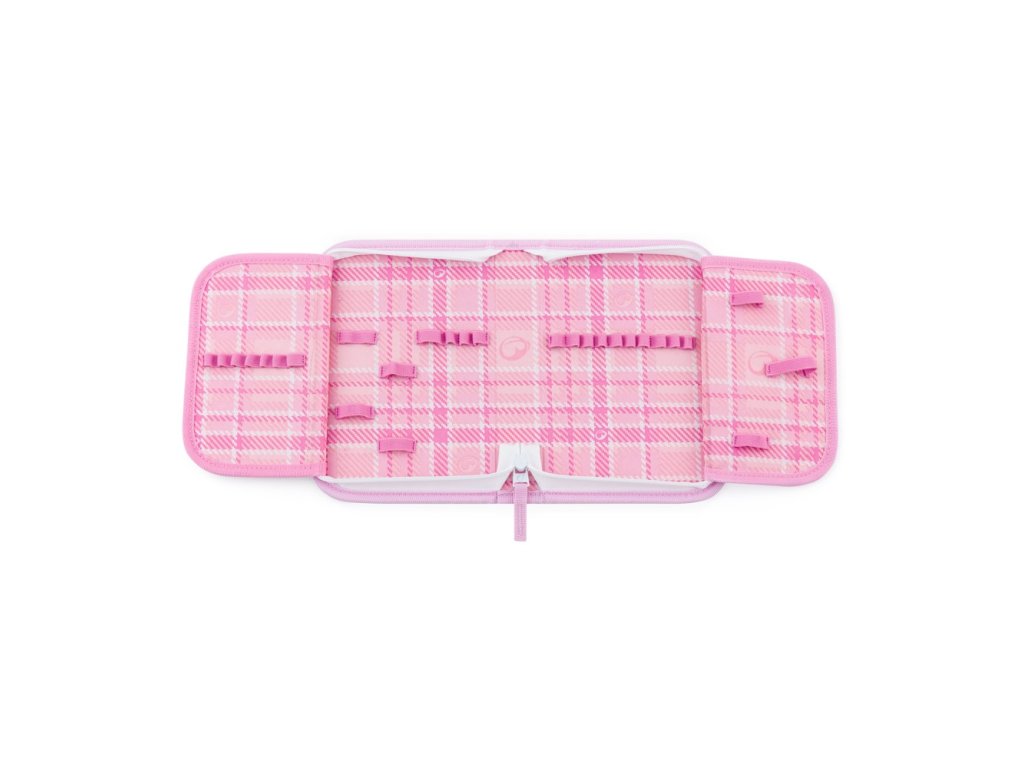 - Na dvou otevíravých chlopních je 35 pružných gumových úchytů na pastelky, pera, fixy, gumu, nůžky, kružítko a další pomůcky.