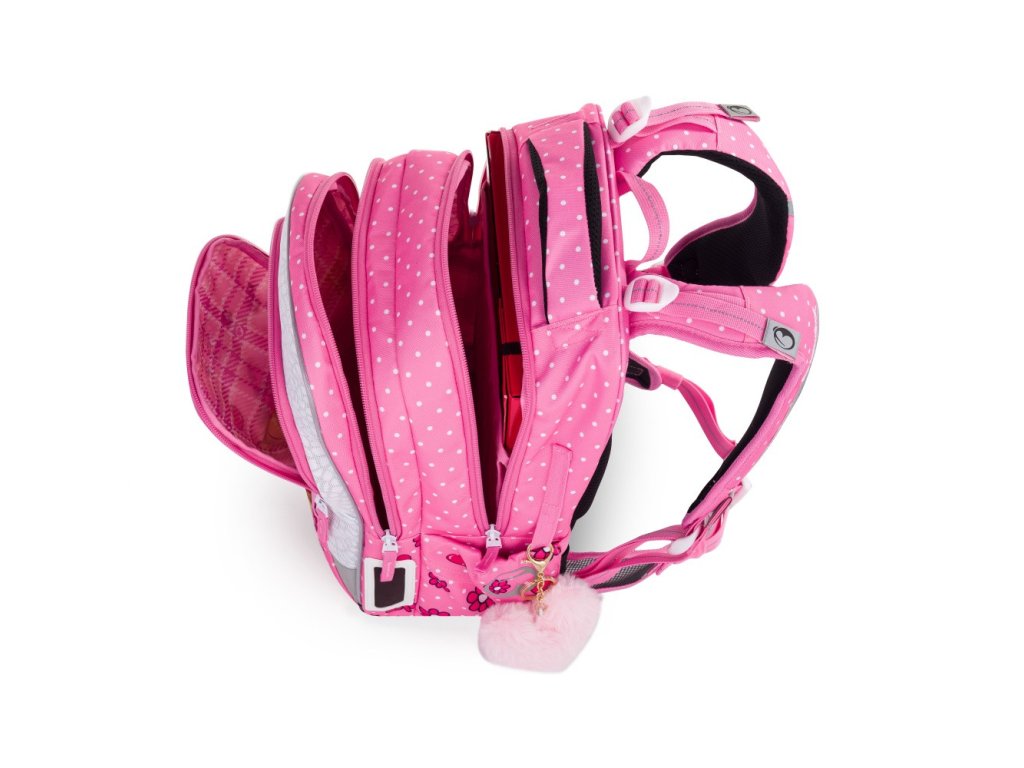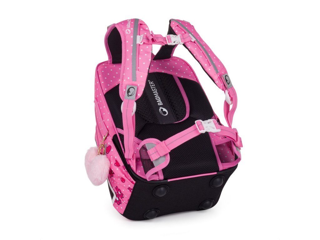 - Ramenní popruhy i zádový systém jsou měkce polstrované. Popruhy se nastavují pomocí horních a dolních plastových spon. Je třeba upravovat délku podle toho, jak školačka roste. Konce popruhů jsou magnetické. Aby neblincaly, jednoduše je magnetem připnete nad plastovou sponu.