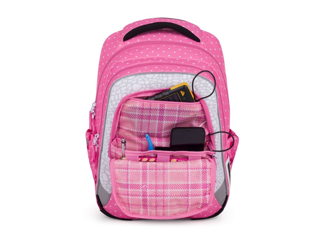 - Na černou přezku v přední kapse můžete školačce připnout síťovaný sáček Třeba na peníze nebo sluchátka. Do kapsičky na zip se vejde power banka. Nabíjecí kabel stačí otevřeným rožkem protáhnout k telefonu umístěnému v organizéru.