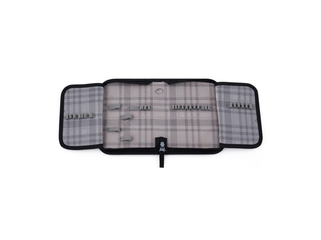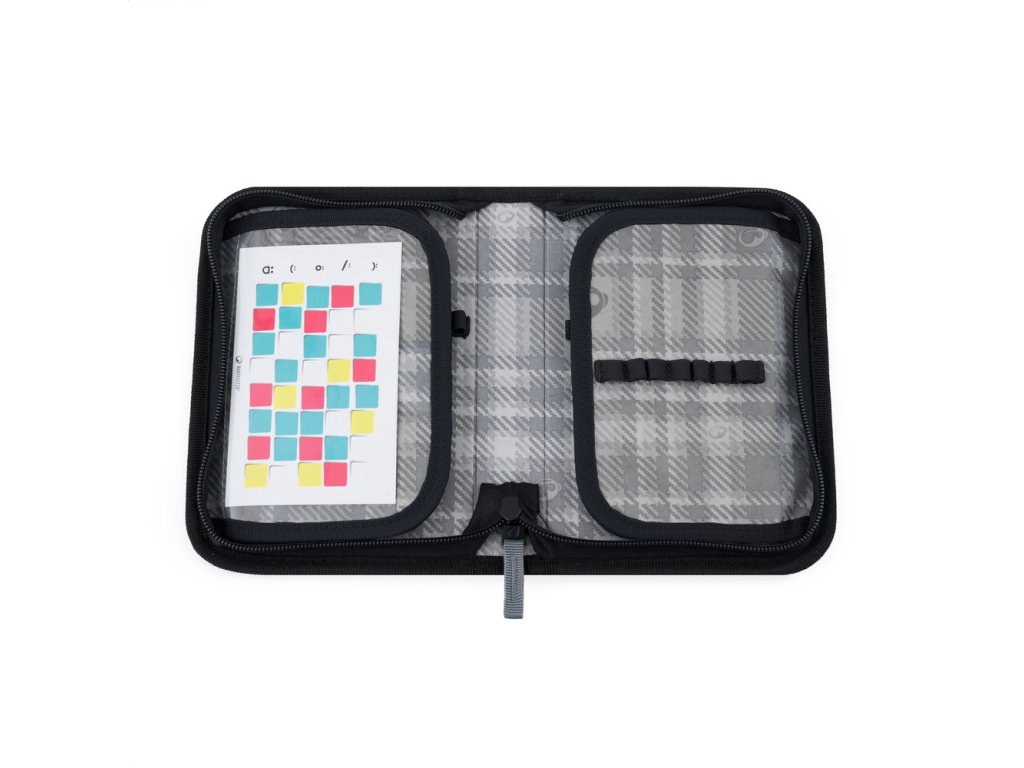 - Na černou přezku v přední kapse můžete školačce připnout síťovaný sáček. Třeba na peníze nebo sluchátka. Do kapsičky na zip se vejde power banka. Nabíjecí kabel stačí otevřeným rožkem protáhnout k telefonu umístěnému v organizéru.