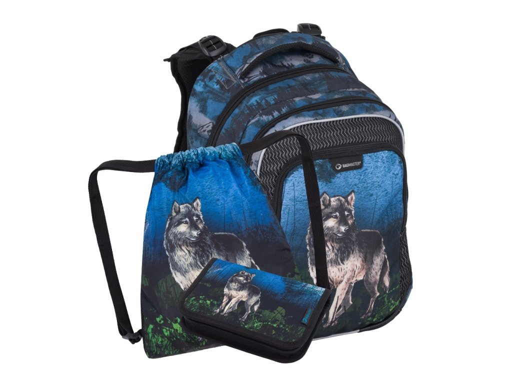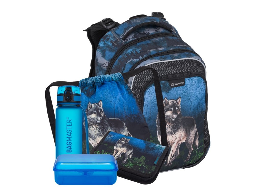 Školní set Bagmaster LUMI 24 F – Vlk (batoh + penál + vak + krabička + láhev)