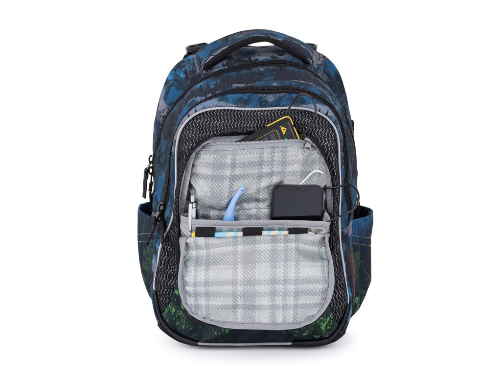 Ergonomický školní batoh s objemem 23 l, lehký jen 0,94 kg, s třemi komorami, polstrovanými zády, nastavitelným hrudním pásem a reflexními prvky pro bezpečí.