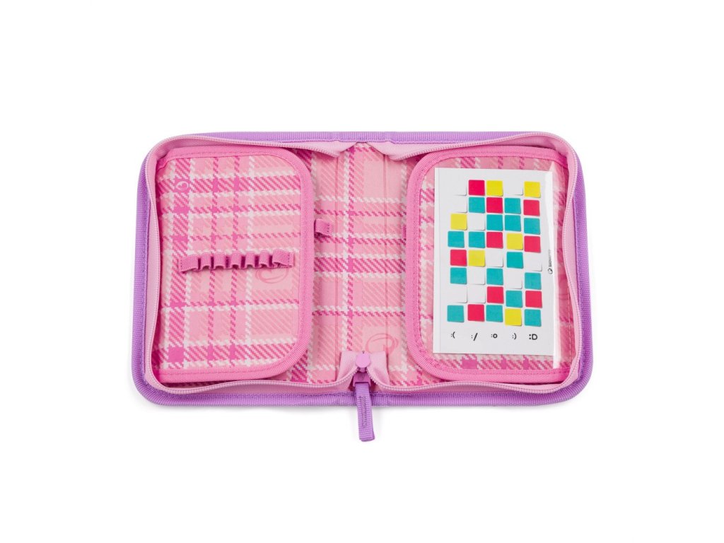 - Otevřením chlopní školačka rozbalí celou řadu pružných gumových úchytů na tužky, pastelky, fixy, kružítko, gumu i ořezávátko.