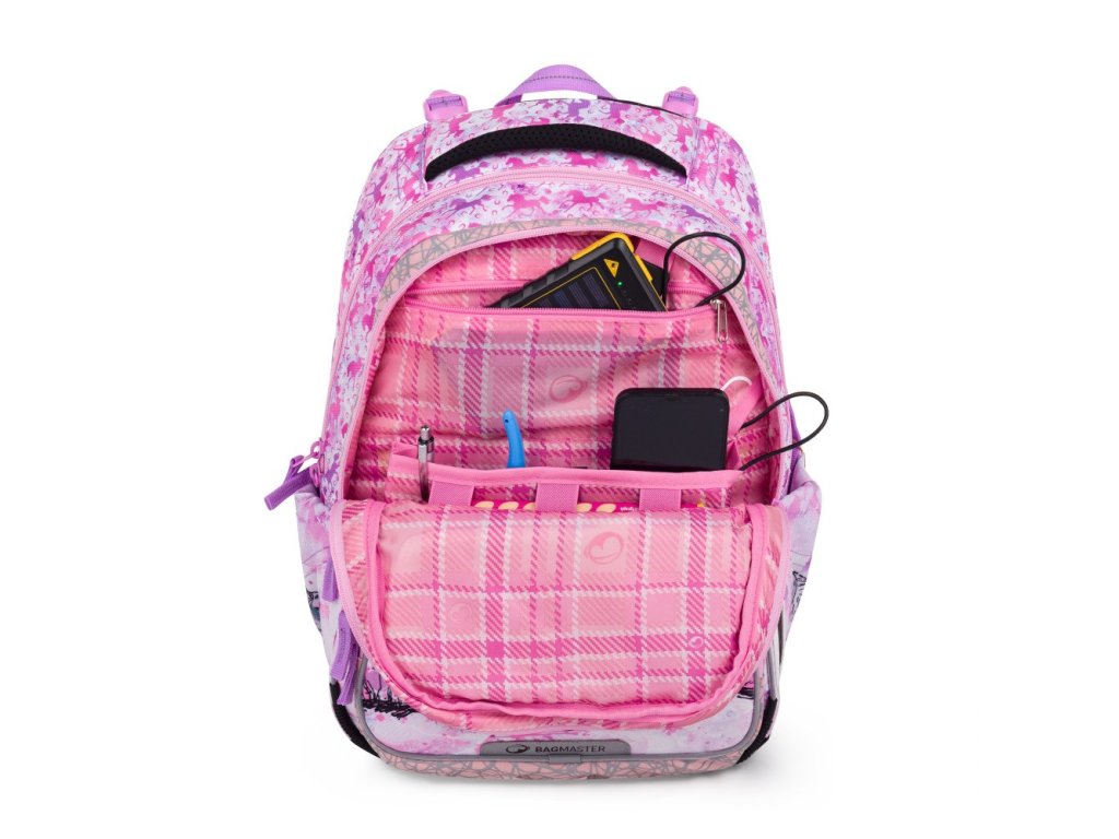 - Drobnější věci si může školačka schovat do kapsy na zip, která je přes celou šířku horní části vaku.