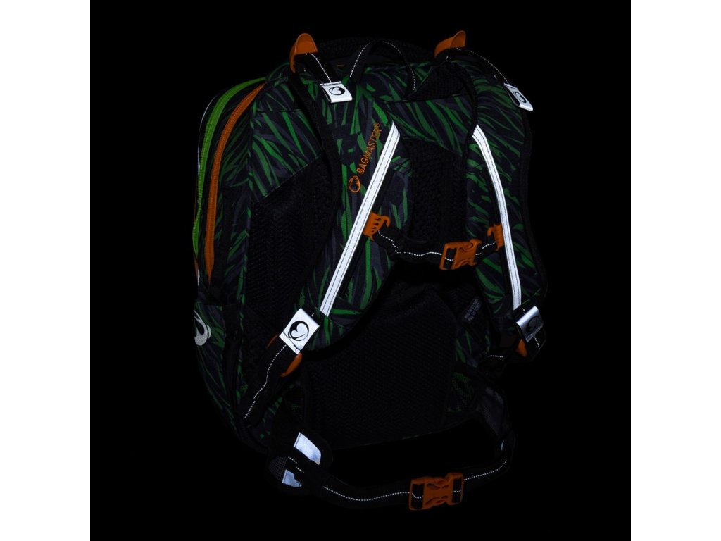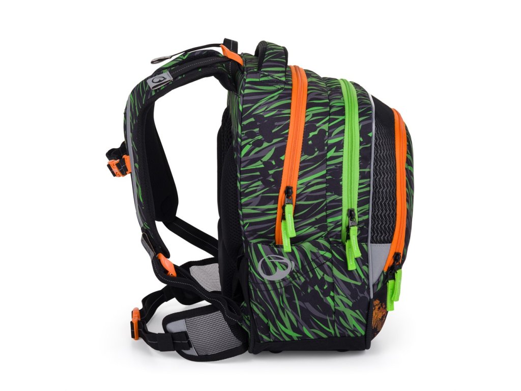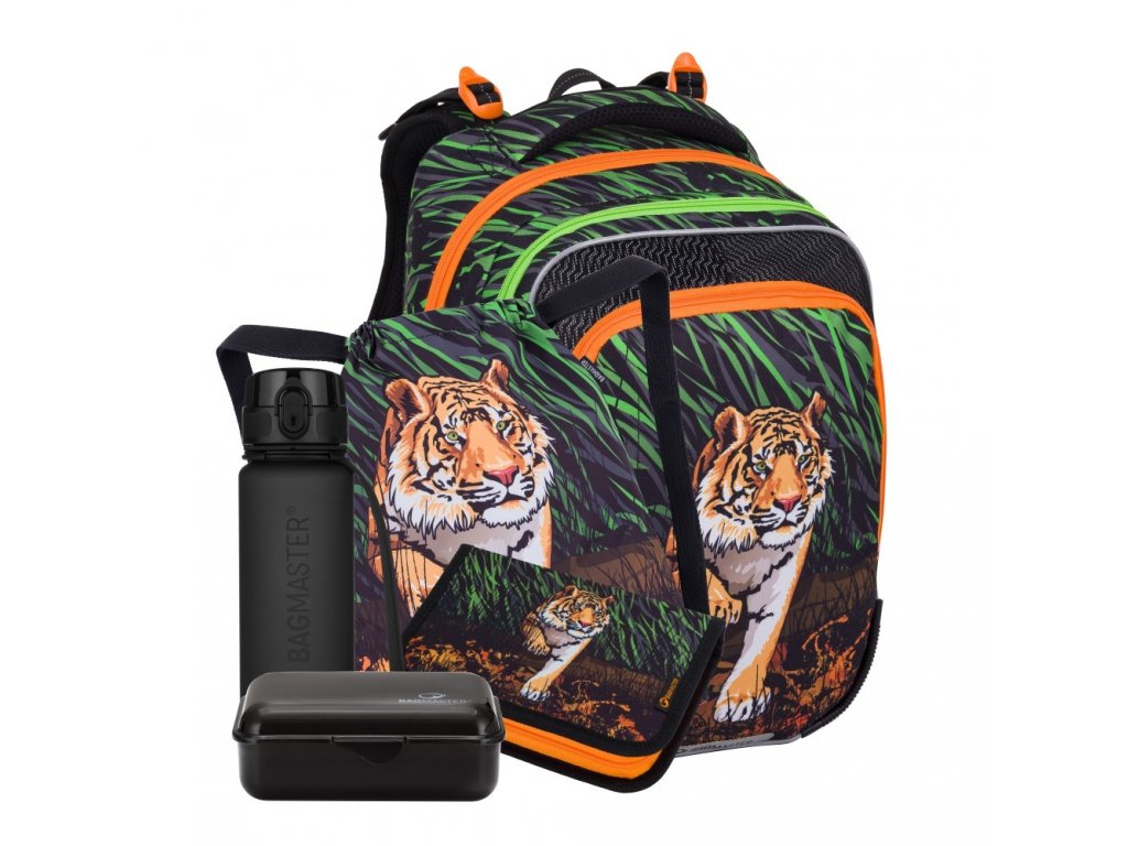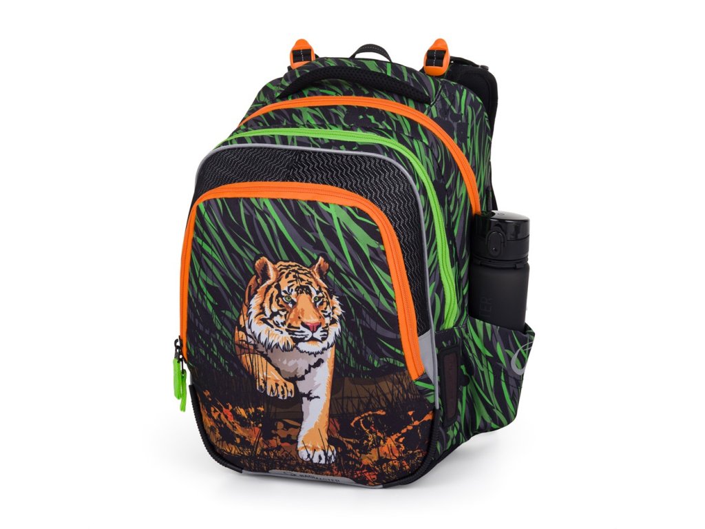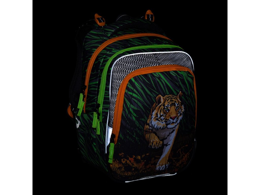 Batoh do školy s tajemným tygrem? Ideální pro všechny malé školáky od 1. do 3. třídy, kteří mají rádi dobrodružství. Batoh má polstrovaná záda a ramenní popruhy, nastavitelný hrudní a bederní pás. Uvnitř je batoh velmi prostorný. Mobil a peněženka najdou místo v praktickém organizéru v přední kapse. Samonavíjecí klíčenka na čip nebo klíče se dá připnout na boční poutko. Školák bude nepřehlédnutelný díky originálnímu motivu a reflexním prvkům. Nechybí ani penál, vak a svačinový set.