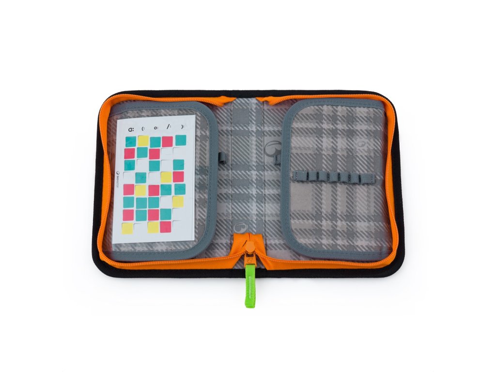 - Na černou přezku v přední kapse můžete školačce připnout síťovaný sáček. Třeba na peníze nebo sluchátka. Do kapsičky na zip se vejde power banka. Nabíjecí kabel stačí otevřeným rožkem protáhnout k telefonu umístěnému v organizéru.