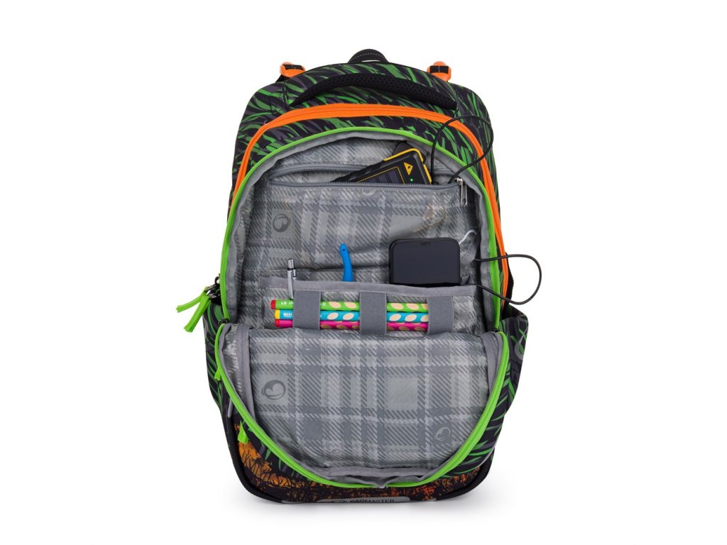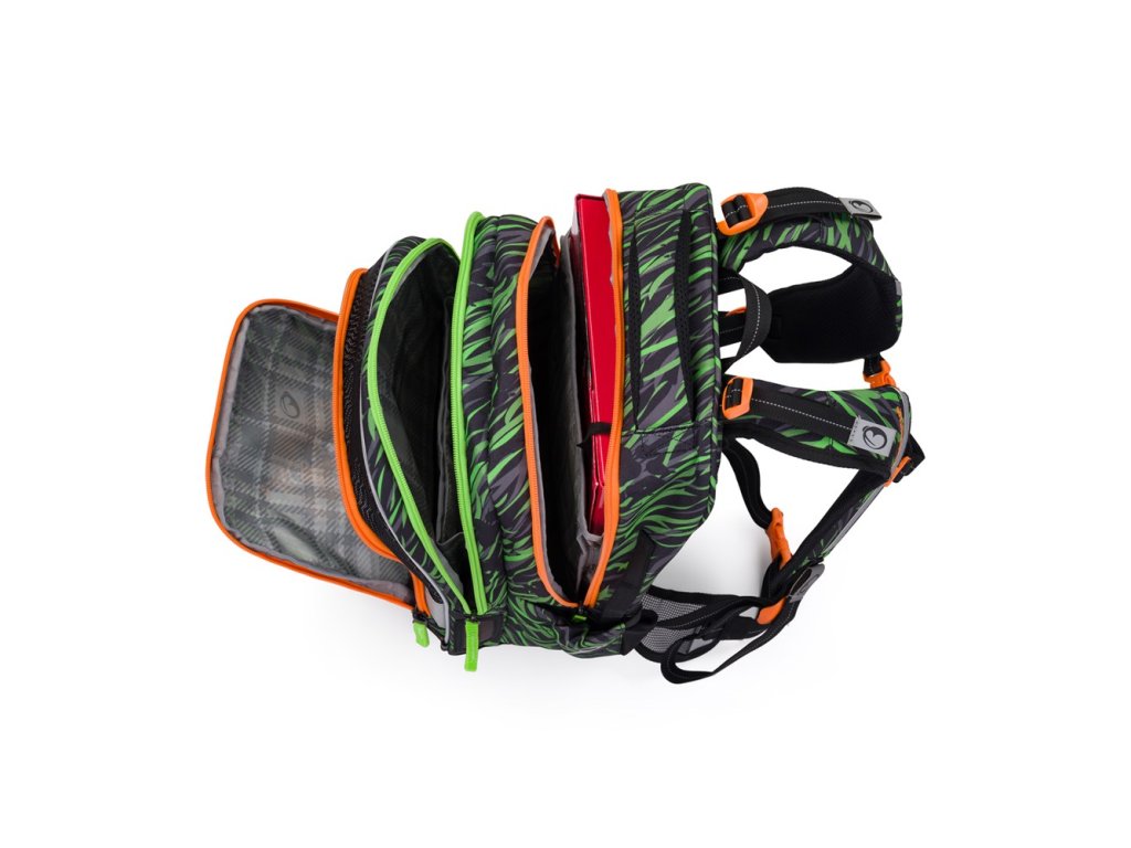 - V hlavní komoře je kompresní kapsa s elastickými postranními pásy na desky A4 a na velké učebnice. Pomáhá přitáhnout a udržet těžké pomůcky co nejvíce u zad, díky tomu má školák těžiště blízko páteře a při chůzi se nehrbí.