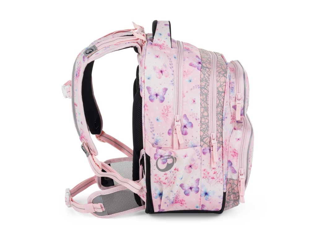 - Lehký a vyjímatelný bederní pás je vyrobený z prodyšné síťoviny. Školák se pod ním nepotí, ani mu bederák nevytváří kolem těla „pneumatiku“. Navíc je opatřený reflexními prvky. Díky bedernímu pásu se váha batohu rozloží z ramenou také na bedra.