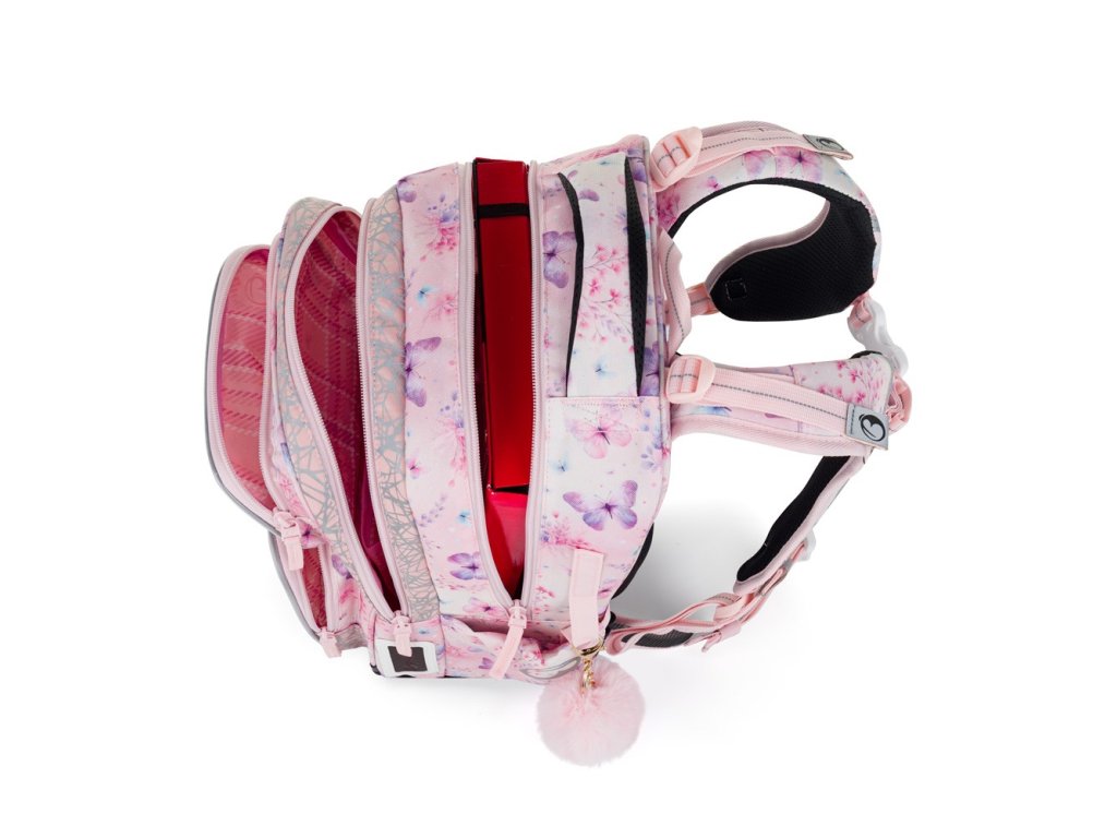 - V hlavní komoře je taky kompresní kapsa s elastickými postranními pásy na desky A4 a na velké učebnice. Pomáhá přitáhnout a udržet těžké pomůcky co nejvíce u zad, díky tomu má školák či školačka těžiště blízko páteře a při chůzi se nehrbí.